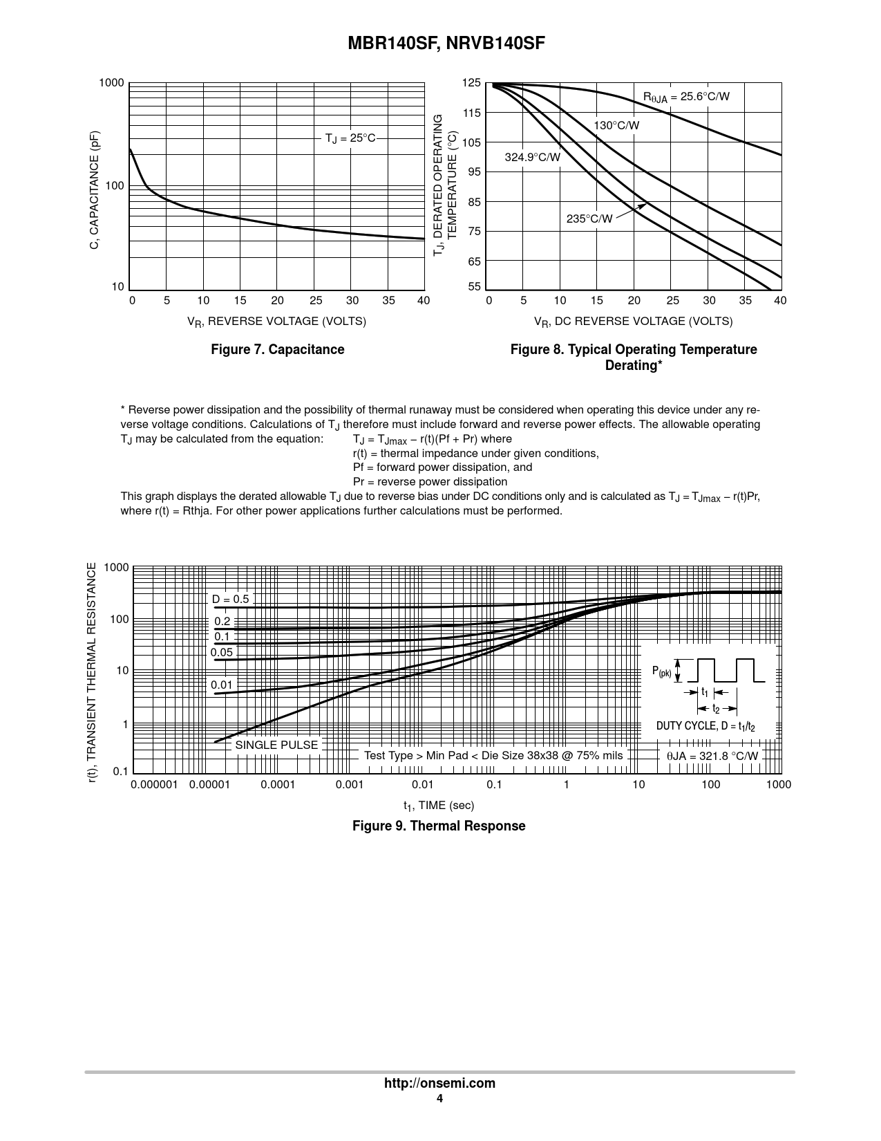 MBR140SF, NRVB140SF 1000 125 RqJA = 25.6°C/W 115 130°C/W T TING J = 25°C °C) 105 324.9°C/W 95 ANCE (pF) TURE ( 100 TED OPERA 85 ACIT 235°C/W 75 , DERA TEMPERA C, CAP JT 65 10 55 0 5 10 15 20 25 30 35 40 0 5 10 15 20 25 30 35 40 V V R, REVERSE VOLTAGE (VOLTS) R, DC REVERSE VOLTAGE (VOLTS) Figure 7. CapacitanceFigure 8. Typical Operating TemperatureDerating* * Reverse power dissipation and the possibility of thermal runaway must be considered when operating this device under any re- verse voltage conditions. Calculations of TJ therefore must include forward and reverse power effects. The allowable operating TJ may be calculated from the equation: TJ = TJmax − r(t)(Pf + Pr) where r(t) = thermal impedance under given conditions, Pf = forward power dissipation, and Pr = reverse power dissipation This graph displays the derated allowable TJ due to reverse bias under DC conditions only and is calculated as TJ = TJmax − r(t)Pr, where r(t) = Rthja. For other power applications further calculations must be performed. 1000 ANCE D = 0.5 100 0.2 0.1 0.05 10 P(pk) 0.01 t1 t2 1 DUTY CYCLE, D = t1/t2 SINGLE PULSE Test Type > Min Pad < Die Size 38x38 @ 75% mils qJA = 321.8 °C/W 0.1 r(t), TRANSIENT THERMAL RESIST 0.000001 0.00001 0.0001 0.001 0.01 0.1 1 10 100 1000 t1, TIME (sec) Figure 9. Thermal Responsehttp://onsemi.com4