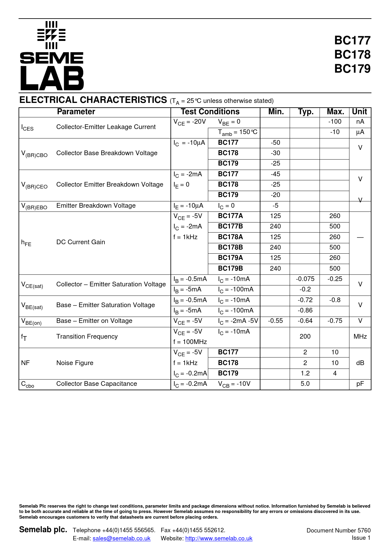 BC177 BC178 BC179ELECTRICAL CHARACTERISTICS (TA = 25°C unless otherwise stated) ParameterTest ConditionsMin.Typ.Max.Unit VCE = -20V VBE = 0 -100 nA ICES Collector-Emitter Leakage Current T µ amb = 150°C -10 A IC = -10µA BC177 -50 V V BC178 (BR)CBO Collector Base Breakdown Voltage -30 BC179 -25 IC = -2mA BC177 -45 V V I (BR)CEO Collector Emitter Breakdown Voltage E = 0 BC178 -25 BC179 -20 V V I (BR)EBO Emitter Breakdown Voltage E = -10µA IC = 0 -5 VCE = -5V BC177A 125 260 IC = -2mA BC177B 240 500 f = 1kHz BC178A 125 260 — hFE DC Current Gain BC178B 240 500 BC179A 125 260 BC179B 240 500 IB = -0.5mA IC = -10mA -0.075 -0.25 VCE(sat) Collector – Emitter Saturation Voltage V IB = -5mA IC = -100mA -0.2 IB = -0.5mA IC = -10mA -0.72 -0.8 VBE(sat) Base – Emitter Saturation Voltage V IB = -5mA IC = -100mA -0.86 V V BE(on) Base – Emitter on Voltage CE = -5V IC = -2mA -5V -0.55 -0.64 -0.75 V VCE = -5V IC = -10mA fT Transition Frequency 200 MHz f = 100MHz VCE = -5V BC177 2 10 NF Noise Figure f = 1kHz BC178 2 10 dB IC = -0.2mA BC179 1.2 4 C I cbo Collector Base Capacitance C = -0.2mA VCB = -10V 5.0 pF Semelab Plc reserves the right to change test conditions, parameter limits and package dimensions without notice. Information furnished by Semelab is believed to be both accurate and reliable at the time of going to press. However Semelab assumes no responsibility for any errors or omissions discovered in its use. Semelab encourages customers to verify that datasheets are current before placing orders.Semelab plc. Telephone +44(0)1455 556565. Fax +44(0)1455 552612. Document Number 5760 E-mail: sales@semelab.co.uk Website: http://www.semelab.co.uk Issue 1