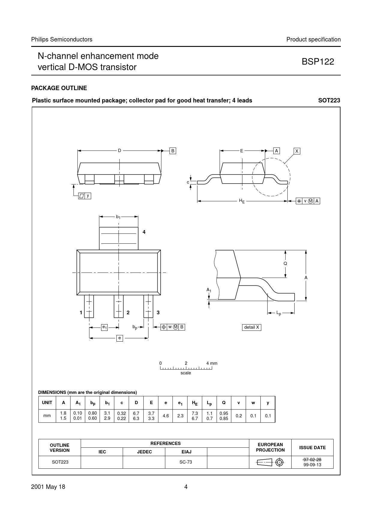 Philips Semiconductors Product specification N-channel enhancement mode BSP122 vertical D-MOS transistor PACKAGE OUTLINEPlastic surface mounted package; collector pad for good heat transfer; 4 leadsSOT223 D B E A X c y HE v M A b1 4 Q A A1 123 Lp e b w M 1 p B detail X e 0 2 4 mm scale DIMENSIONS (mm are the original dimensions)UNITAA1bpbcDEee11HELpQvwy 1.8 0.10 0.80 3.1 0.32 6.7 3.7 7.3 1.1 0.95 mm 4.6 2.3 0.2 0.1 0.1 1.5 0.01 0.60 2.9 0.22 6.3 3.3 6.7 0.7 0.85 REFERENCESOUTLINEEUROPEANISSUE DATEVERSIONPROJECTIONIECJEDECEIAJ 97-02-28 SOT223 SC-73 99-09-13 2001 May 18 4 Document Outline FEATURES QUICK REFERENCE DATA DESCRIPTION PINNING - SOT223 LIMITING VALUES THERMAL CHARACTERISTICS CHARACTERISTICS PACKAGE OUTLINE SOT223 DATA SHEET STATUS DEFINITIONS DISCLAIMERS NOTES