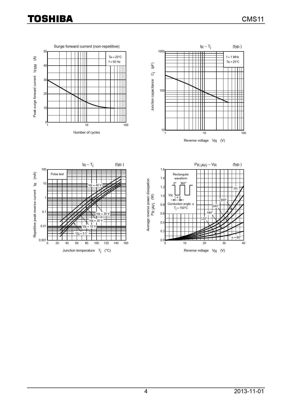 CMS11. Surge. forward. current. (non-repetitive). IR. –. Tj. (typ.). 50. 1000. ). Ta. =. 25°C. f. =. 1. MHz. (A. f. =. 50. Hz. Ta. =. 25°C. 40. (pF). j. t. I. FSM. C. 30. rren. ance. d. cu. ar. acit