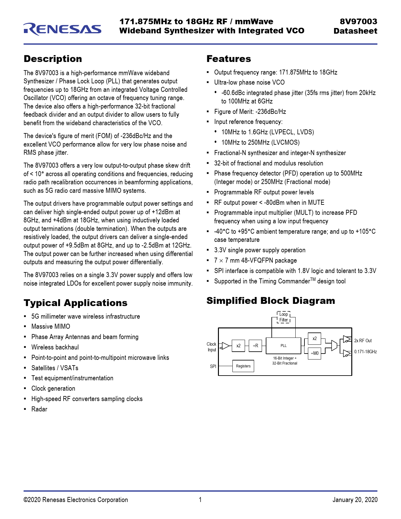 171.875MHz to 18GHz RF / mmWave 8V97003 Wideband Synthesizer with Integrated VCO Datasheet Description Features