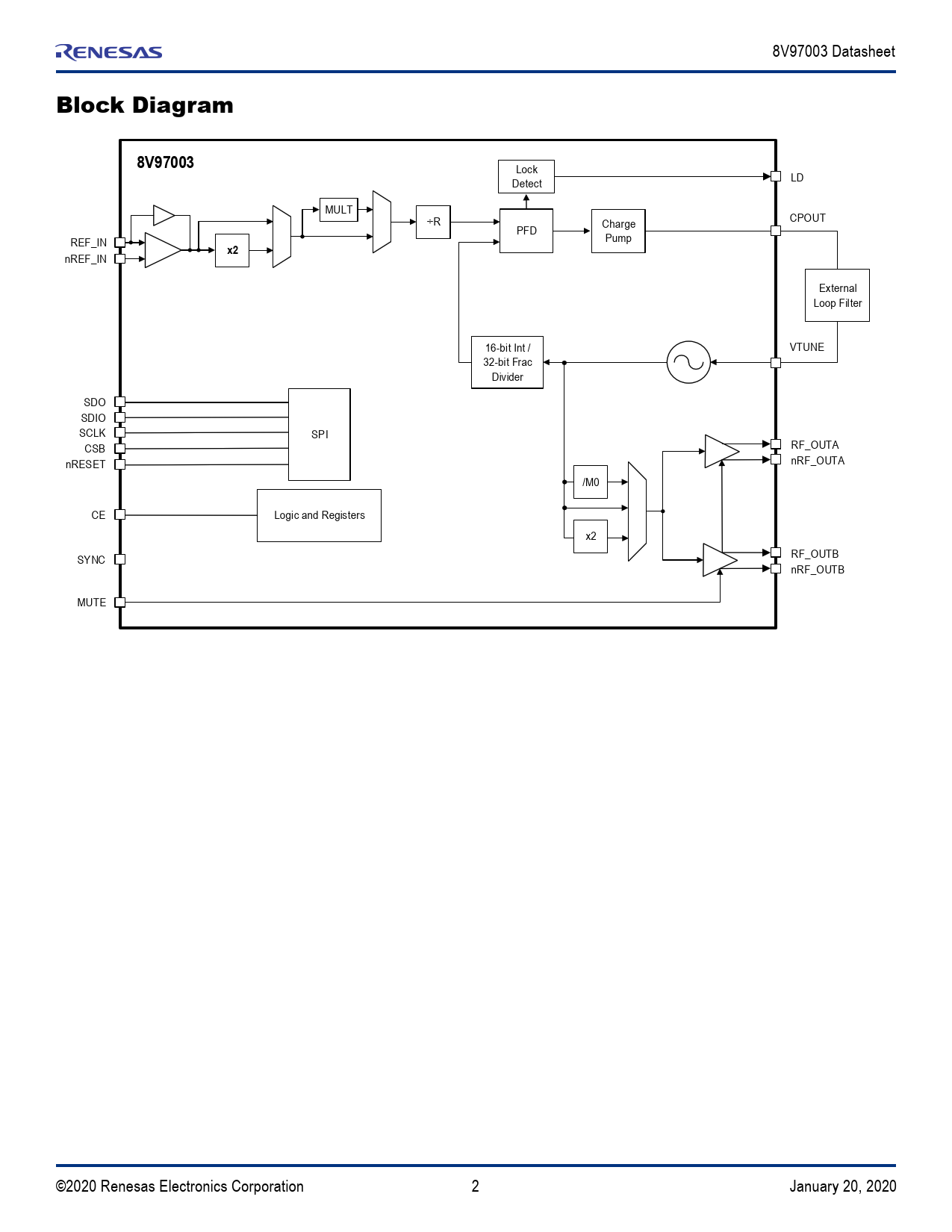 nREF_IN External Loop Filter 16-bit Int / VTUNE 32-bit Frac Divider SDO SDIO SCLK SPI RF_OUTA CSB nRF_OUTA nRESET /M0 CE Logic and Registers x2 RF_OUTB SYNC nRF_OUTB MUTE ©2020 Renesas Electronics Corporation 2 January 20, 2020 Document Outline Description Typical Applications Features Simplified Block Diagram Block Diagram Contents List of Figures List of Tables Pin Assignments Pin Descriptions Absolute Maximum Ratings Recommended Operating Conditions Thermal Characteristics and Reliability Information DC Electrical Characteristics AC Electrical Characteristics Typical Performance Characteristics Theory of Operation Synthesizer Programming Reference Input Stage Input Reference Divider (R) Reference Doubler Reference Multiplier (MULT) Feedback Divider Phase and Frequency Detector (PFD) and Charge Pump PFD Frequency External Loop Filter Charge Pump High-Impedance Integrated Low Noise VCO Output Clock Distribution and Optional Output Doubler Output Matching Band Selection Disable Phase Adjust RF Output Power Output Phase Synchronization Power-Down Mode Default Power-Up Conditions VCO Calibration 3- or 4-Wire SPI Interface Description 3/4-Wire Mode Active Clock Edge Reset Least Significant Bit Position Addressing Read Operation Mirrored Register Bits Double-Buffered Registers Operation Protocols Register Map Register Block Descriptions Preface Registers Feedback Divider Control Registers Phase Adjustments Control Registers DSM Control Registers Calibration Control Registers Band Select Clock Divider Control Registers Lock Detect Control Registers Power Down Control Registers Input Control Registers Charge Pump Control Registers Re-Sync Control Registers Output Control Registers Status Registers Applications Information Loop Filter Calculations Recommendations for Unused Input and Output Pins Schematic Example Power Considerations Package Outline Drawings Marking Diagram Ordering Information Revision History