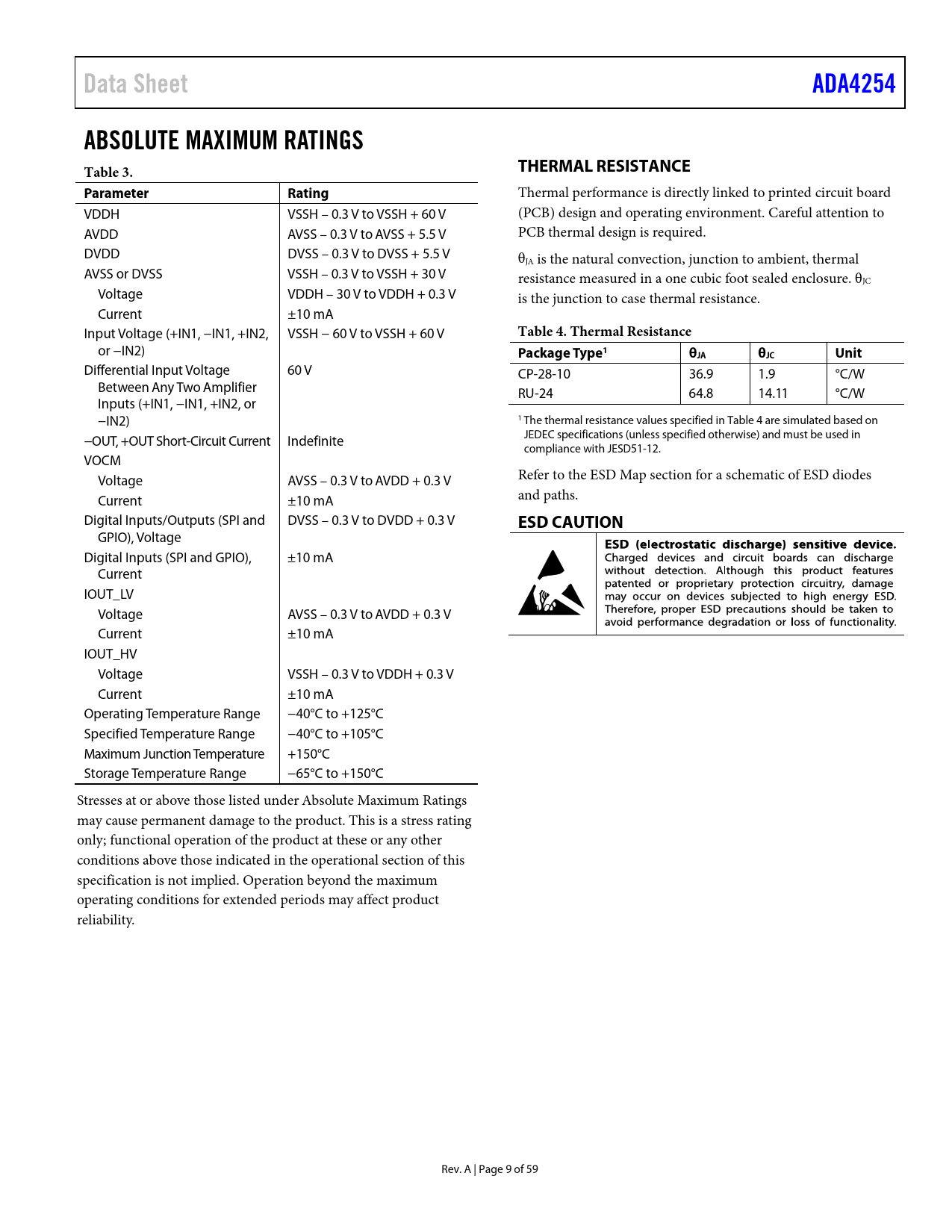 Pages / Page59 / 9 — Data Sheet. ADA4254. ABSOLUTE MAXIMUM RATINGS Table 3. THERMAL …