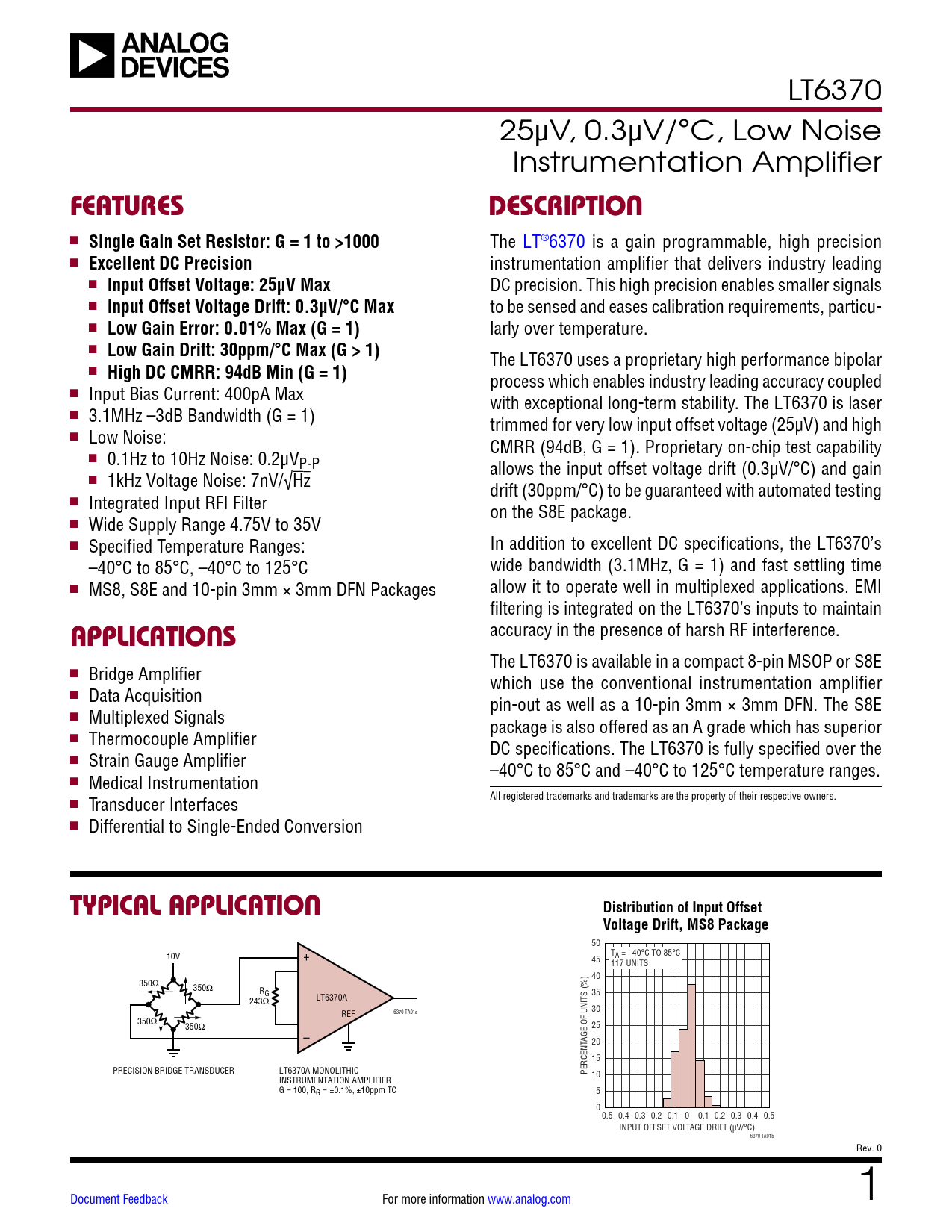 LT6370 25µV, 0.3µV/°C, Low Noise Instrumentation Amplifier