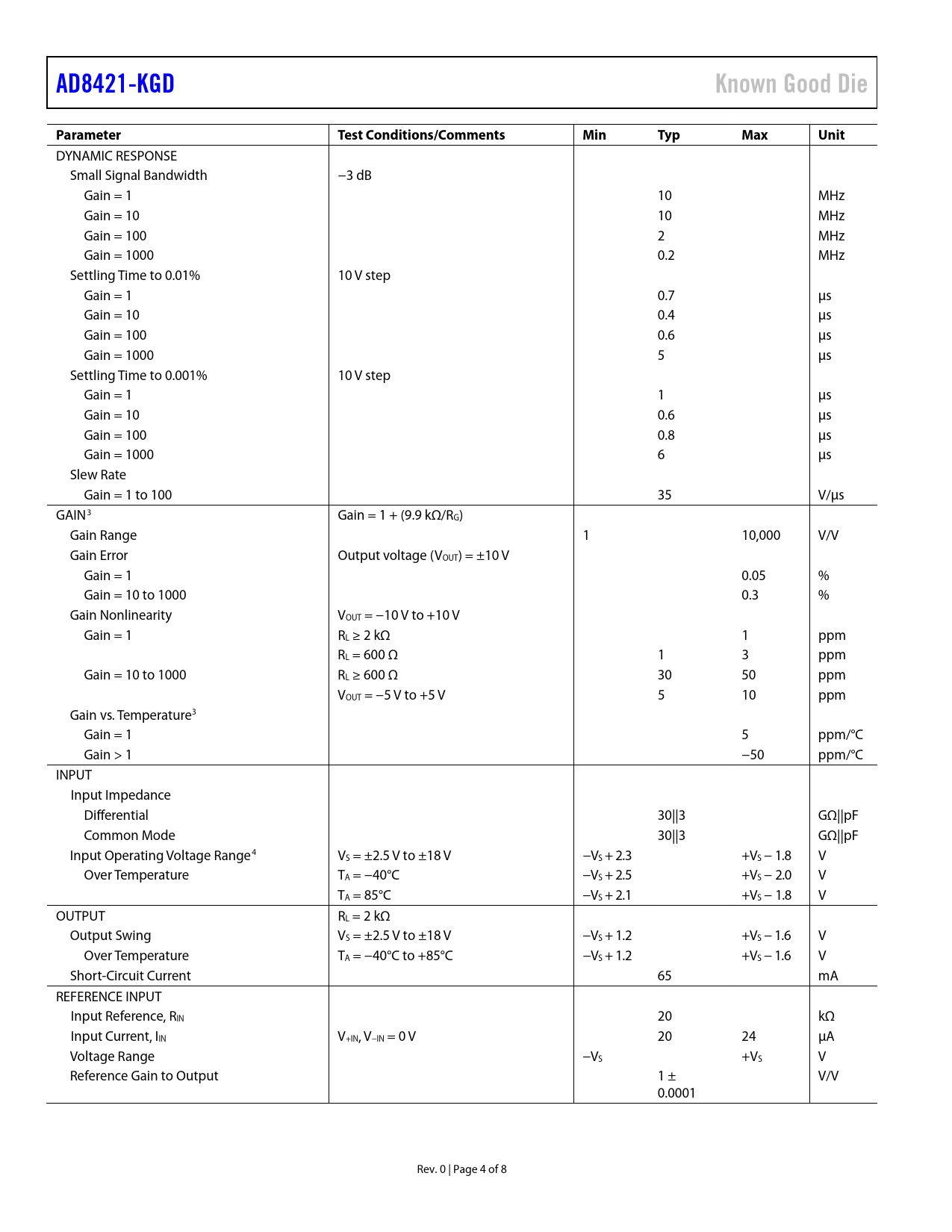link to page 5 link to page 5 link to page 5 AD8421-KGDKnown Good DieParameterTest Conditions/CommentsMinTypMaxUnit DYNAMIC RESPONSE Small Signal Bandwidth −3 dB Gain = 1 10 MHz Gain = 10 10 MHz Gain = 100 2 MHz Gain = 1000 0.2 MHz Settling Time to 0.01% 10 V step Gain = 1 0.7 µs Gain = 10 0.4 µs Gain = 100 0.6 µs Gain = 1000 5 µs Settling Time to 0.001% 10 V step Gain = 1 1 µs Gain = 10 0.6 µs Gain = 100 0.8 µs Gain = 1000 6 µs Slew Rate Gain = 1 to 100 35 V/µs GAIN3 Gain = 1 + (9.9 kΩ/RG) Gain Range 1 10,000 V/V Gain Error Output voltage (VOUT) = ±10 V Gain = 1 0.05 % Gain = 10 to 1000 0.3 % Gain Nonlinearity VOUT = −10 V to +10 V Gain = 1 RL ≥ 2 kΩ 1 ppm RL = 600 Ω 1 3 ppm Gain = 10 to 1000 RL ≥ 600 Ω 30 50 ppm VOUT = −5 V to +5 V 5 10 ppm Gain vs. Temperature3 Gain = 1 5 ppm/°C Gain > 1 −50 ppm/°C INPUT Input Impedance Differential 30||3 GΩ||pF Common Mode 30||3 GΩ||pF Input Operating Voltage Range4 VS = ±2.5 V to ±18 V −VS + 2.3 +VS − 1.8 V Over Temperature TA = −40°C −VS + 2.5 +VS − 2.0 V TA = 85°C −VS + 2.1 +VS − 1.8 V OUTPUT RL = 2 kΩ Output Swing VS = ±2.5 V to ±18 V −VS + 1.2 +VS − 1.6 V Over Temperature TA = −40°C to +85°C −VS + 1.2 +VS − 1.6 V Short-Circuit Current 65 mA REFERENCE INPUT Input Reference, RIN 20 kΩ Input Current, IIN V+IN, V−IN = 0 V 20 24 µA Voltage Range −VS +VS V Reference Gain to Output 1 ± V/V 0.0001 Rev. 0 | Page 4 of 8 Document Outline FEATURES APPLICATIONS GENERAL DESCRIPTION FUNCTIONAL BLOCK DIAGRAM TABLE OF CONTENTS REVISION HISTORY SPECIFICATIONS ABSOLUTE MAXIMUM RATINGS ESD CAUTION PIN CONFIGURATION AND FUNCTION DESCRIPTIONS OUTLINE DIMENSIONS DIE SPECIFICATIONS AND ASSEMBLY RECOMMENDATIONS ORDERING GUIDE