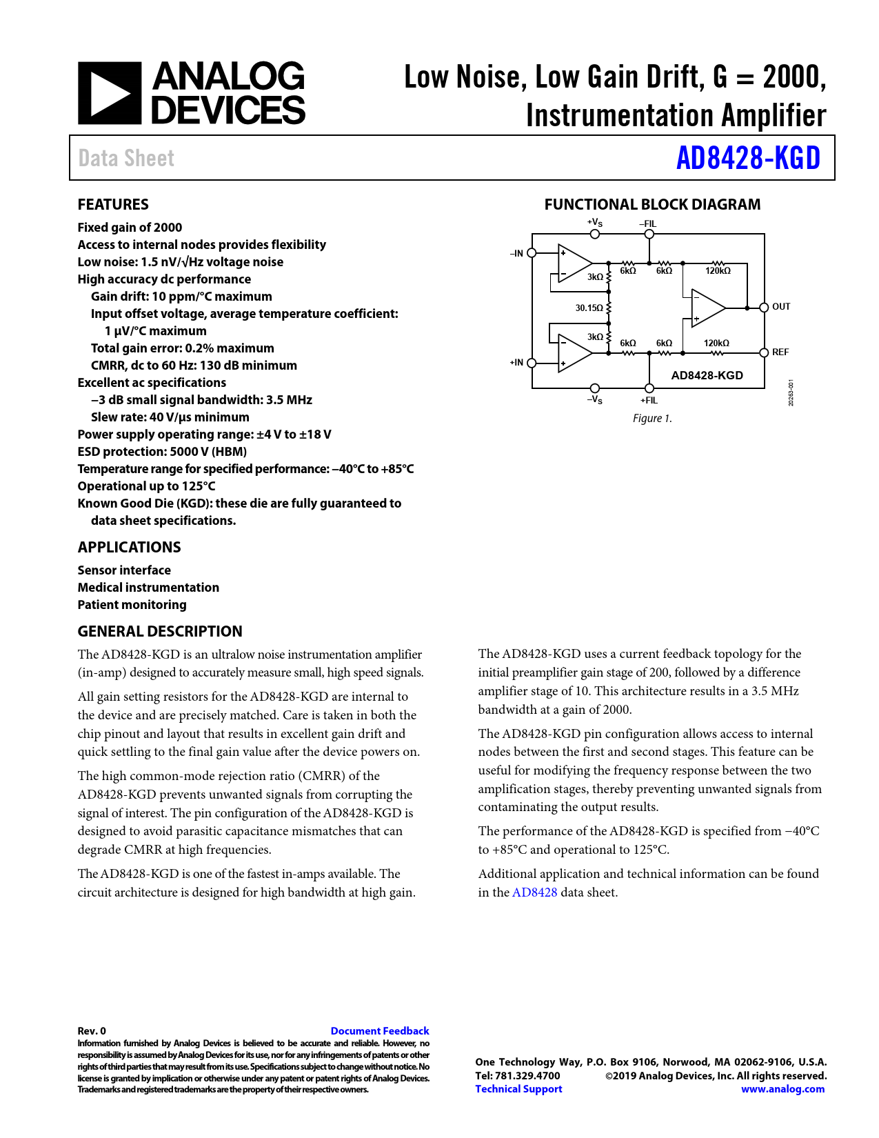 Low Noise, Low Gain Drift, G = 2000,. Instrumentation Amplifier. Data Sheet. AD8428-KGD. FEATURES. FUNCTIONAL BLOCK DIAGRAM