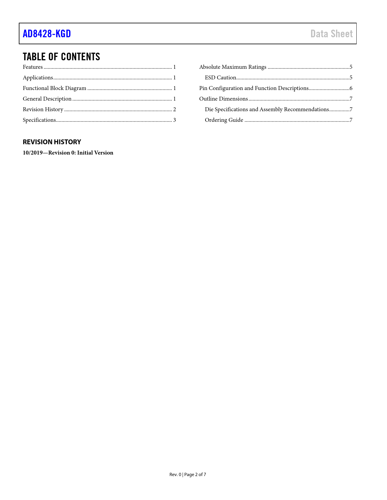 link to page 1 link to page 1 link to page 1 link to page 1 link to page 2 link to page 3 link to page 5 link to page 5 link to page 6 link to page 7 link to page 7 link to page 7 AD8428-KGDData SheetTABLE OF CONTENTS Features .. 1 Absolute Maximum Ratings ..5 Applications ... 1 ESD Caution...5 Functional Block Diagram .. 1 Pin Configuration and Function Descriptions ..6 General Description ... 1 Outline Dimensions ..7 Revision History ... 2 Die Specifications and Assembly Recommendations ...7 Specifications ... 3 Ordering Guide ...7 REVISION HISTORY10/2019—Revision 0: Initial Version Rev. 0 | Page 2 of 7 Document Outline FEATURES APPLICATIONS FUNCTIONAL BLOCK DIAGRAM GENERAL DESCRIPTION TABLE OF CONTENTS REVISION HISTORY SPECIFICATIONS ABSOLUTE MAXIMUM RATINGS ESD CAUTION PIN CONFIGURATION AND FUNCTION DESCRIPTIONS OUTLINE DIMENSIONS DIE SPECIFICATIONS AND ASSEMBLY RECOMMENDATIONS ORDERING GUIDE