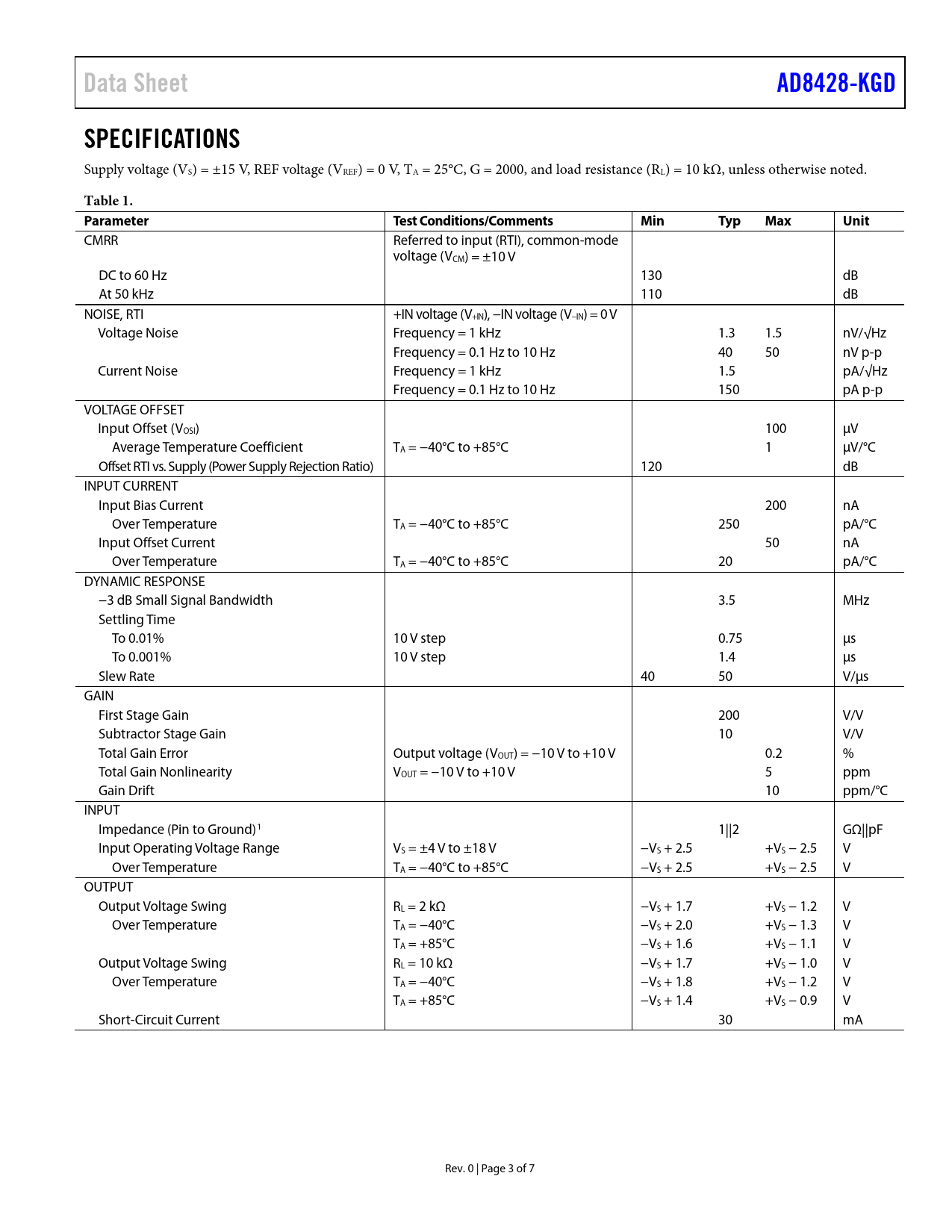 Pages / Page7 / 3 — Data Sheet. AD8428-KGD. SPECIFICATIONS. Table 1. Parameter. Test …
