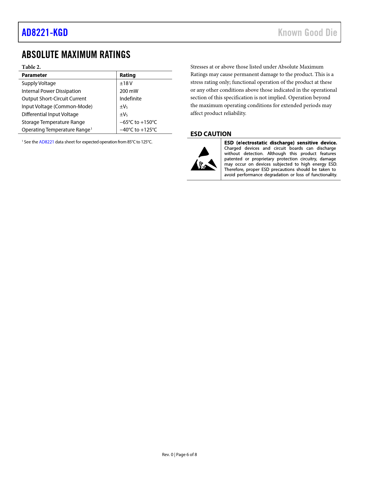 AD8221-KGD Known Good Die ABSOLUTE MAXIMUM RATINGS Table 2 Parameter Rating ESD CAUTION