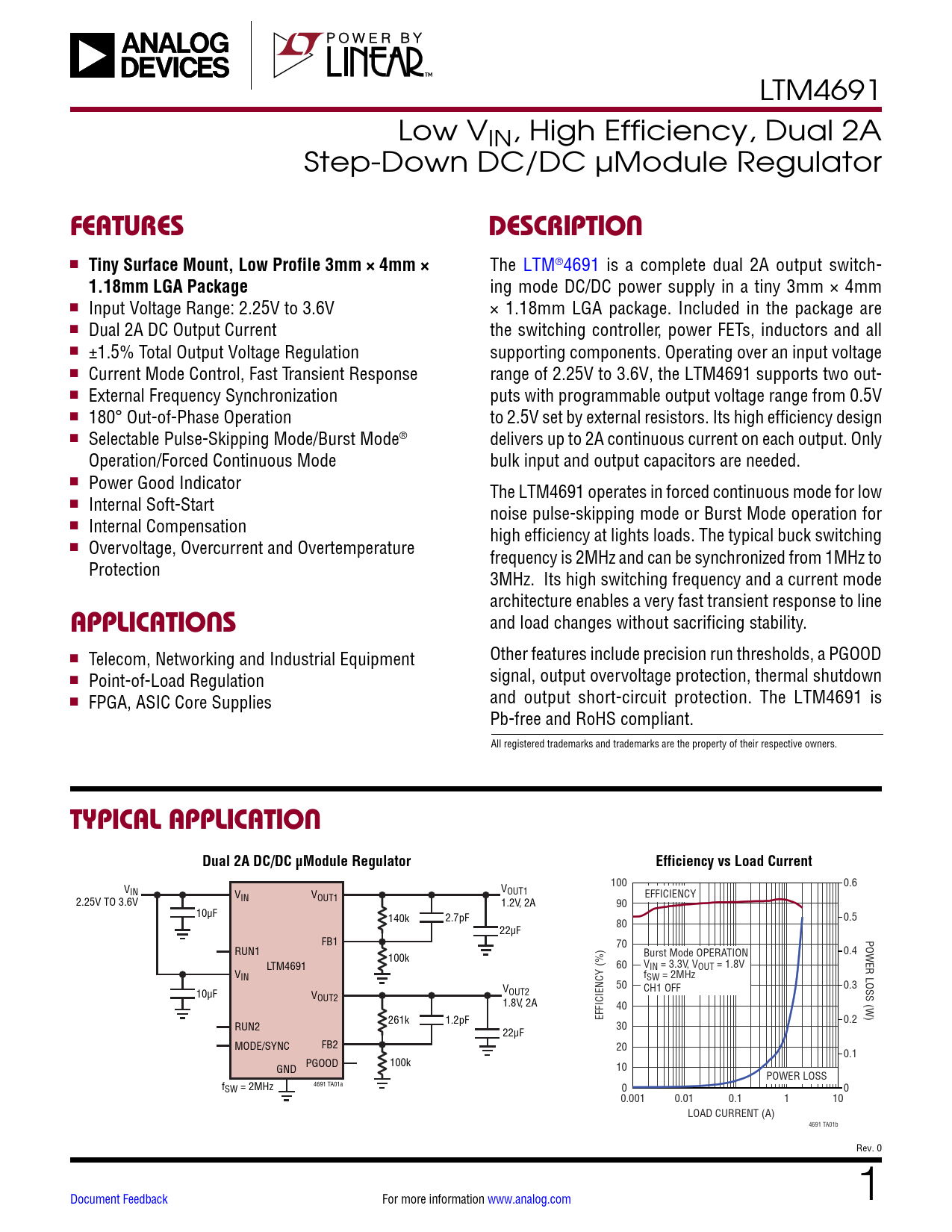 LTM4691 Low VIN, High Efficiency, Dual 2A Step-Down DC/DC µModule Regulator FEATURESDESCRIPTION n Tiny Surface Mount, Low Profile 3mm × 4mm × The LTM®4691 is a complete dual 2A output switch- 1.18mm LGA Package ing mode DC/DC power supply in a tiny 3mm × 4mm n Input Voltage Range: 2.25V to 3.6V × 1.18mm LGA package. Included in the package are n Dual 2A DC Output Current the switching control er, power FETs, inductors and al n ±1.5% Total Output Voltage Regulation supporting components. Operating over an input voltage n Current Mode Control, Fast Transient Response range of 2.25V to 3.6V, the LTM4691 supports two out- n External Frequency Synchronization puts with programmable output voltage range from 0.5V n 180° Out-of-Phase Operation to 2.5V set by external resistors. Its high efficiency design n Selectable Pulse-Skipping Mode/Burst Mode® delivers up to 2A continuous current on each output. Only Operation/Forced Continuous Mode bulk input and output capacitors are needed. n Power Good Indicator The LTM4691 operates in forced continuous mode for low n Internal Soft-Start noise pulse-skipping mode or Burst Mode operation for n Internal Compensation high efficiency at lights loads. The typical buck switching n Overvoltage, Overcurrent and Overtemperature frequency is 2MHz and can be synchronized from 1MHz to Protection 3MHz. Its high switching frequency and a current mode architecture enables a very fast transient response to line APPLICATIONS and load changes without sacrificing stability. n Other features include precision run thresholds, a PGOOD Telecom, Networking and Industrial Equipment n signal, output overvoltage protection, thermal shutdown Point-of-Load Regulation n and output short-circuit protection. The LTM4691 is FPGA, ASIC Core Supplies Pb-free and RoHS compliant. All registered trademarks and trademarks are the property of their respective owners. TYPICAL APPLICATIONDual 2A DC/DC μModule RegulatorEfficiency vs Load Current V 100 0.6 IN V VOUT1 IN VOUT1 EFFICIENCY 2.25V TO 3.6V 1.2V, 2A 90 10µF 140k 2.7pF 0.5 80 22µF FB1 POWER LOSS (W) 70 RUN1 Burst Mode OPERATION 0.4 100k LTM4691 60 VIN = 3.3V, VOUT = 1.8V VIN fSW = 2MHz 50 CH1 OFF 0.3 10µF V VOUT2 OUT2 1.8V, 2A 40 261k 1.2pF EFFICIENCY (%) 0.2 RUN2 22µF 30 MODE/SYNC FB2 20 0.1 PGOOD 100k GND 10 POWER LOSS 4691 TA01a fSW = 2MHz 0 0 0.001 0.01 0.1 1 10 LOAD CURRENT (A) 4691 TA01b Rev. 0 Document Feedback For more information www.analog.com 1 Document Outline Features Applications Typical Application Description Absolute Maximum Ratings Order Information Electrical Characteristics Pin Configuration Typical Performance Characteristics Pin Functions Block Diagram Decoupling Requirements Operation Applications Information VIN to VOUT Step-Down Ratios Output Voltage Programming Input Decoupling Capacitors Output Decoupling Capacitors Mode Selection Operating Frequency and External Synchronization Power GOOD Output Overvoltage Protection Output Voltage Soft-Start Dropout Operation Output Short-Circuit Protection and Recovery Load Sharing Using the Precision RUN Threshold Thermal Considerations and Output Current Derating Safety Considerations Layout Checklist/Example Applications Information Typical Applications Pin Configuration Table LTM4691 Component LGA Pinout Package Description Package Photo Related Parts