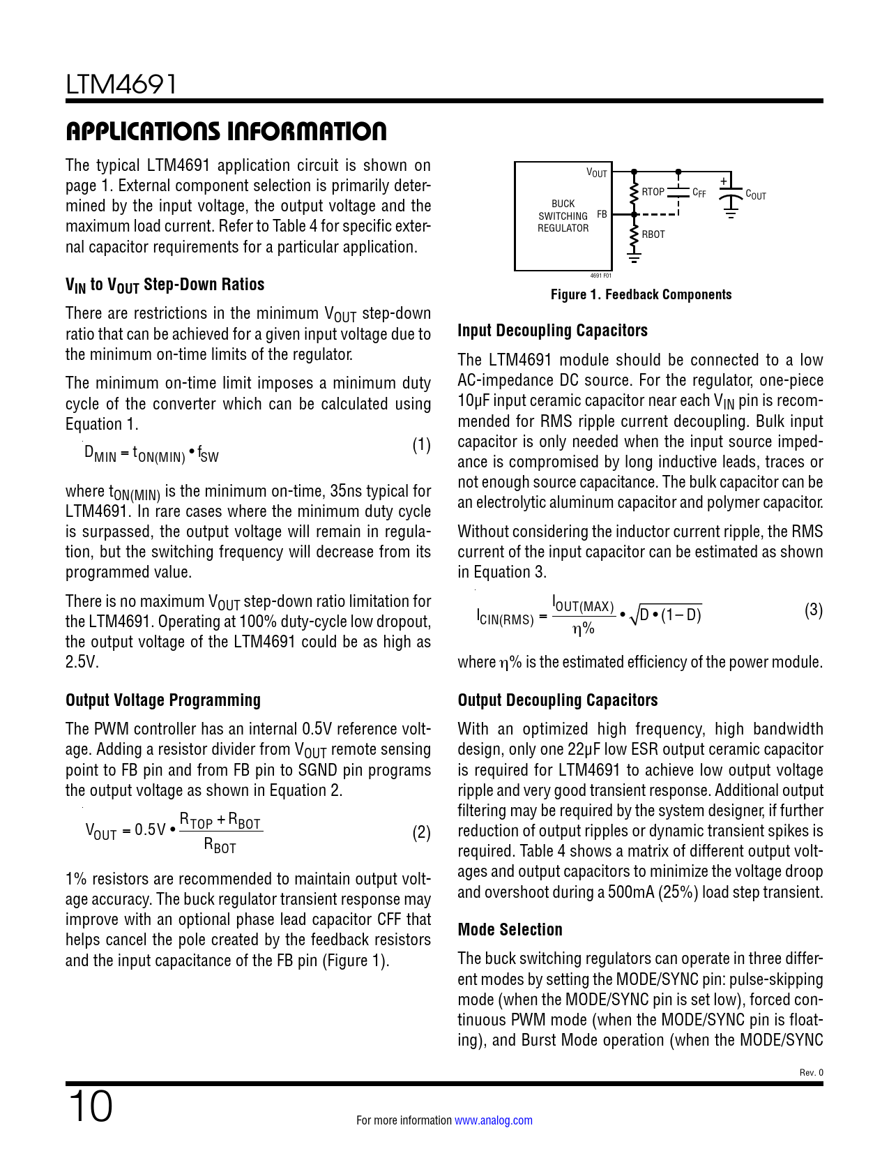 link to page 17 link to page 10 link to page 10 link to page 10 link to page 17 LTM4691 APPLICATIONS INFORMATION The typical LTM4691 application circuit is shown on V page 1. External component selection is primarily deter- OUT + RTOP CFF C mined by the input voltage, the output voltage and the OUT BUCK SWITCHING FB maximum load current. Refer to Table 4 for specific exter- REGULATOR RBOT nal capacitor requirements for a particular application. V 4691 F01 IN to VOUT Step-Down RatiosFigure 1. Feedback Components There are restrictions in the minimum VOUT step-down ratio that can be achieved for a given input voltage due to Input Decoupling Capacitors the minimum on-time limits of the regulator. The LTM4691 module should be connected to a low The minimum on-time limit imposes a minimum duty AC-impedance DC source. For the regulator, one-piece cycle of the converter which can be calculated using 10µF input ceramic capacitor near each VIN pin is recom- Equation 1. mended for RMS ripple current decoupling. Bulk input (1) capacitor is only needed when the input source imped- D MIN = tON(MIN) • fSW ance is compromised by long inductive leads, traces or where t not enough source capacitance. The bulk capacitor can be ON(MIN) is the minimum on-time, 35ns typical for LTM4691. In rare cases where the minimum duty cycle an electrolytic aluminum capacitor and polymer capacitor. is surpassed, the output voltage will remain in regula- Without considering the inductor current ripple, the RMS tion, but the switching frequency will decrease from its current of the input capacitor can be estimated as shown programmed value. in Equation 3. There is no maximum VOUT step-down ratio limitation for IOUT(MAX) (3) the LTM4691. Operating at 100% duty-cycle low dropout, ICIN(RMS) = • D • (1– D) η% the output voltage of the LTM4691 could be as high as 2.5V. where η% is the estimated efficiency of the power module. Output Voltage ProgrammingOutput Decoupling Capacitors The PWM controller has an internal 0.5V reference volt- With an optimized high frequency, high bandwidth age. Adding a resistor divider from VOUT remote sensing design, only one 22μF low ESR output ceramic capacitor point to FB pin and from FB pin to SGND pin programs is required for LTM4691 to achieve low output voltage the output voltage as shown in Equation 2. ripple and very good transient response. Additional output R filtering may be required by the system designer, if further V TOP + RBOT OUT = 0.5V • (2) reduction of output ripples or dynamic transient spikes is RBOT required. Table 4 shows a matrix of different output volt- 1% resistors are recommended to maintain output volt- ages and output capacitors to minimize the voltage droop age accuracy. The buck regulator transient response may and overshoot during a 500mA (25%) load step transient. improve with an optional phase lead capacitor CFF that helps cancel the pole created by the feedback resistors Mode Selection and the input capacitance of the FB pin (Figure 1). The buck switching regulators can operate in three differ- ent modes by setting the MODE/SYNC pin: pulse-skipping mode (when the MODE/SYNC pin is set low), forced con- tinuous PWM mode (when the MODE/SYNC pin is float- ing), and Burst Mode operation (when the MODE/SYNC Rev. 0 10 For more information www.analog.com Document Outline Features Applications Typical Application Description Absolute Maximum Ratings Order Information Electrical Characteristics Pin Configuration Typical Performance Characteristics Pin Functions Block Diagram Decoupling Requirements Operation Applications Information VIN to VOUT Step-Down Ratios Output Voltage Programming Input Decoupling Capacitors Output Decoupling Capacitors Mode Selection Operating Frequency and External Synchronization Power GOOD Output Overvoltage Protection Output Voltage Soft-Start Dropout Operation Output Short-Circuit Protection and Recovery Load Sharing Using the Precision RUN Threshold Thermal Considerations and Output Current Derating Safety Considerations Layout Checklist/Example Applications Information Typical Applications Pin Configuration Table LTM4691 Component LGA Pinout Package Description Package Photo Related Parts