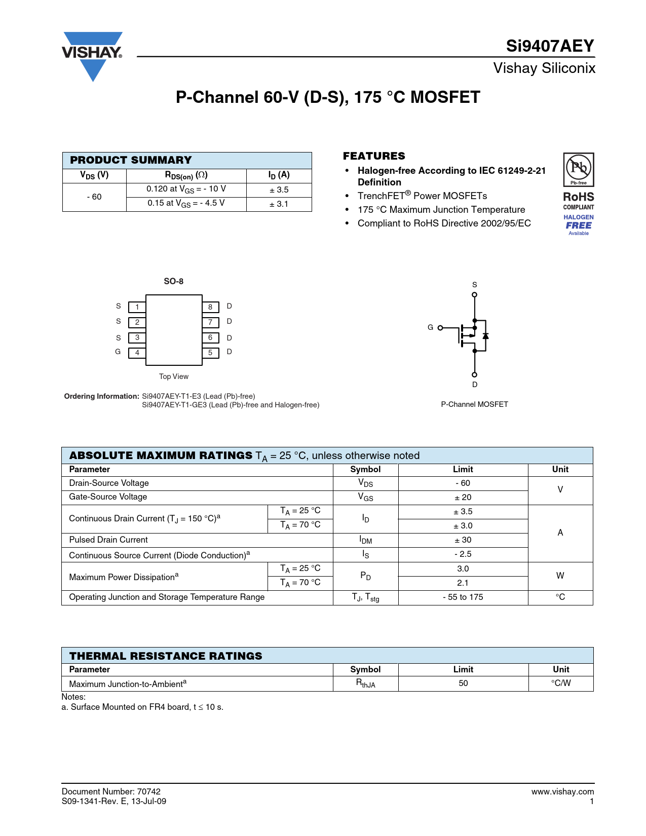 Si9407AEY Vishay Siliconix P-Channel 60-V (D-S), 175 °C MOSFETFEATURESPRODUCT SUMMARY • Halogen-free According to IEC 61249-2-21VDS (V)RDS(on) ( Ω )ID (A)Definition 0.120 at VGS = - 10 V ± 3.5 - 60 • TrenchFET® Power MOSFETs 0.15 at VGS = - 4.5 V ± 3.1 • 175 °C Maximum Junction Temperature • Compliant to RoHS Directive 2002/95/EC SO-8 S S 1 8 D S 2 7 D G S 3 6 D G 4 5 D Top View D Ordering Information: Si9407AEY-T1-E3 (Lead (Pb)-free) Si9407AEY-T1-GE3 (Lead (Pb)-free and Halogen-free) P-Channel MOSFET ABSOLUTE MAXIMUM RATINGS TA = 25 °C, unless otherwise noted Parameter SymbolLimitUnit Drain-Source Voltage VDS - 60 V Gate-Source Voltage VGS ± 20 TA = 25 °C ± 3.5 Continuous Drain Current (T I J = 150 °C)a D TA = 70 °C ± 3.0 A Pulsed Drain Current IDM ± 30 Continuous Source Current (Diode Conduction)a IS - 2.5 TA = 25 °C 3.0 Maximum Power Dissipationa PD W TA = 70 °C 2.1 Operating Junction and Storage Temperature Range TJ, Tstg - 55 to 175 °C THERMAL RESISTANCE RATINGS Parameter SymbolLimitUnit Maximum Junction-to-Ambienta RthJA 50 °C/W Notes: a. Surface Mounted on FR4 board, t ≤ 10 s. Document Number: 70742 www.vishay.com S09-1341-Rev. E, 13-Jul-09 1