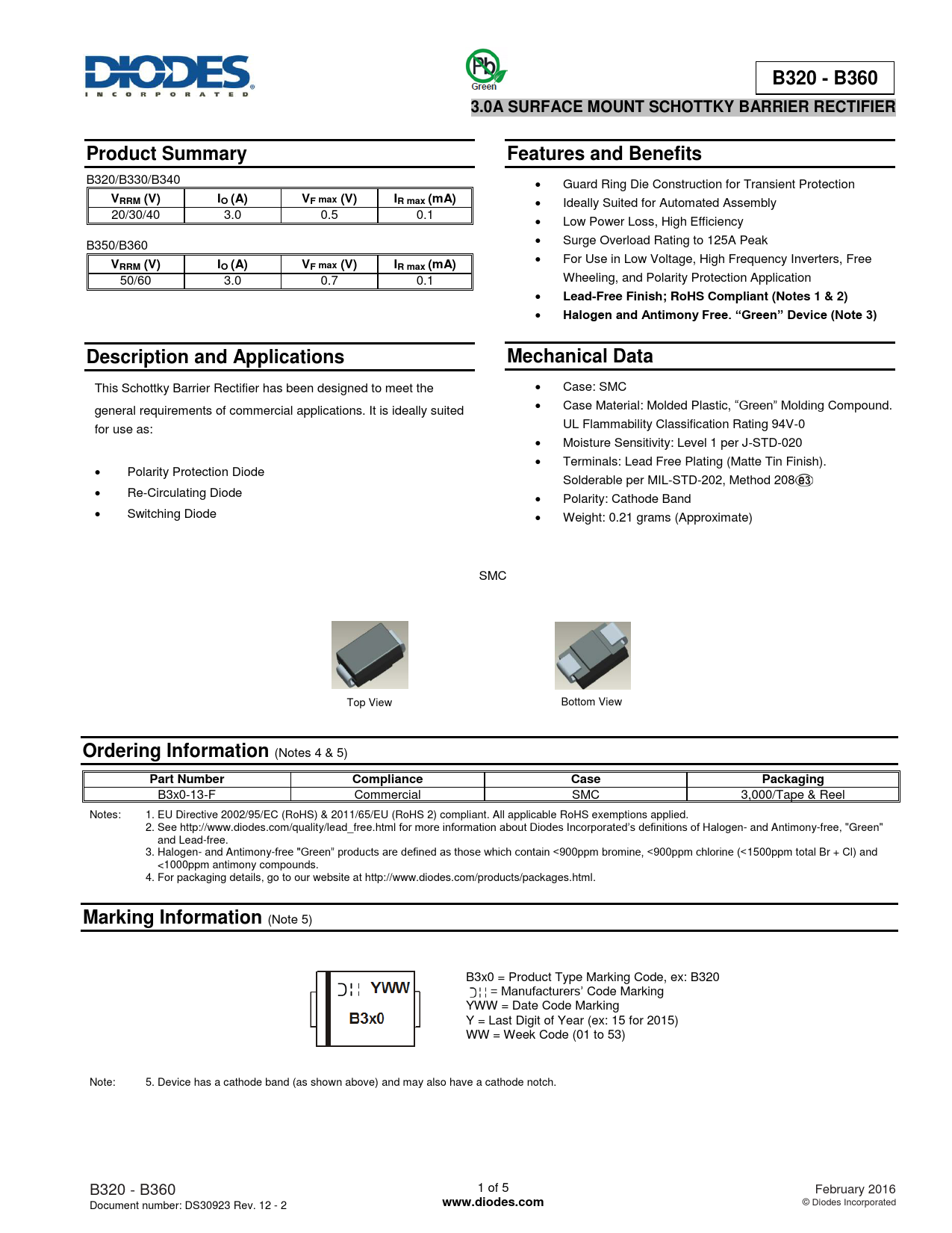 (Note 5) B3x0 = Product Type Marking Code, ex: B320 = Manufacturers’ Code Marking YWW = Date Code Marking Y = Last Digit of Year (ex: 15 for 2015) WW = Week Code (01 to 53) Note: 5. Device has a cathode band (as shown above) and may also have a cathode notch. B320 - B360 1 of 5 February 2016 Document number: DS30923 Rev. 12 - 2