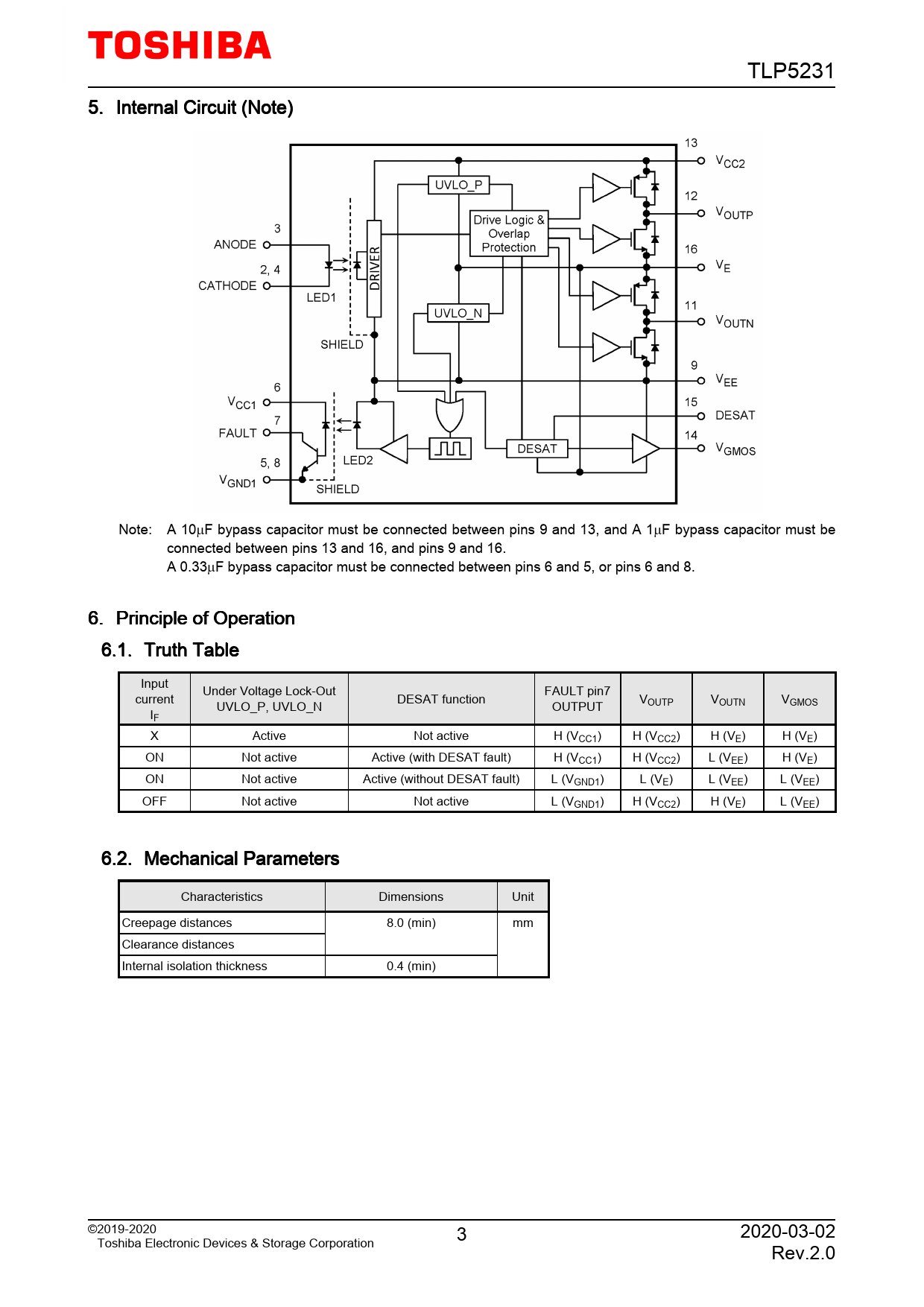 TLP5231. 5. Internal. Circuit. (Note). Note:. A. 10µF. bypass. capacitor. must. be. connected. between. pins. 9. and. 13,. and. A. 1µF. bypass. capacitor. must. be