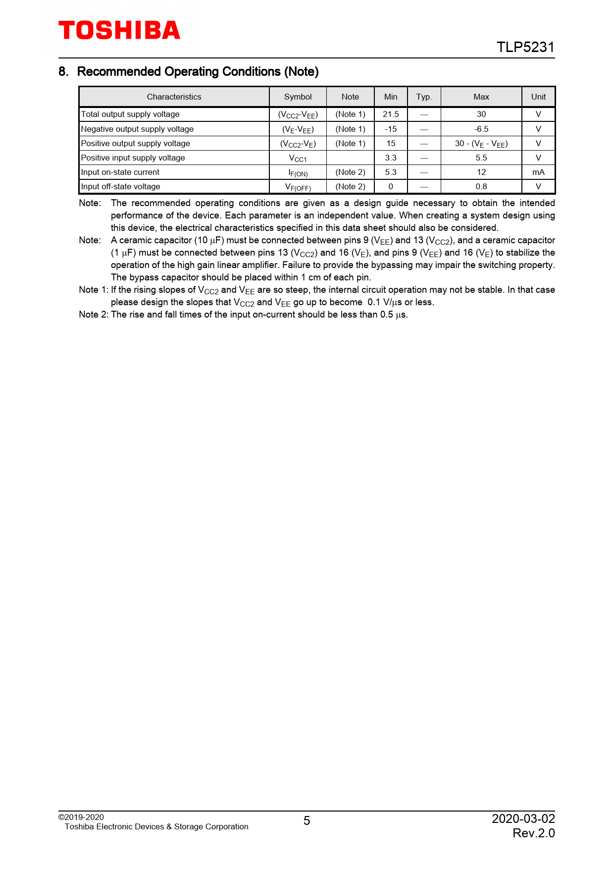 TLP5231 8. Recommended Operating Conditions (Note) Characteristics Symbol Note Min Typ. Max Unit Total output supply voltage (VCC2-VEE) (Note 1) 21.5 30 V Negative output supply voltage (VE-VEE) (Note 1) -15 -6.5 V Positive output supply voltage (VCC2-VE) (Note 1) 15 30 - (VE - VEE) V Positive input supply voltage VCC1 3.3 5.5 V Input on-state current IF(ON) (Note 2) 5.3 12 mA Input off-state voltage VF(OFF) (Note 2) 0 0.8 V Note: The recommended operating conditions are given as a design guide necessary to obtain the intended performance of the device. Each parameter is an independent value. When creating a system design using this device, the electrical characteristics specified in this data sheet should also be considered. Note: A ceramic capacitor (10 µF) must be connected between pins 9 (VEE) and 13 (VCC2), and a ceramic capacitor (1 µF) must be connected between pins 13 (VCC2) and 16 (VE), and pins 9 (VEE) and 16 (VE) to stabilize the operation of the high gain linear amplifier. Failure to provide the bypassing may impair the switching property. The bypass capacitor should be placed within 1 cm of each pin. Note 1: If the rising slopes of VCC2 and VEE are so steep, the internal circuit operation may not be stable. In that case please design the slopes that VCC2 and VEE go up to become 0.1 V/µs or less. Note 2: The rise and fall times of the input on-current should be less than 0.5 µs. ©2019-2020 5 2020-03-02 Toshiba Electronic Devices & Storage Corporation Rev.2.0