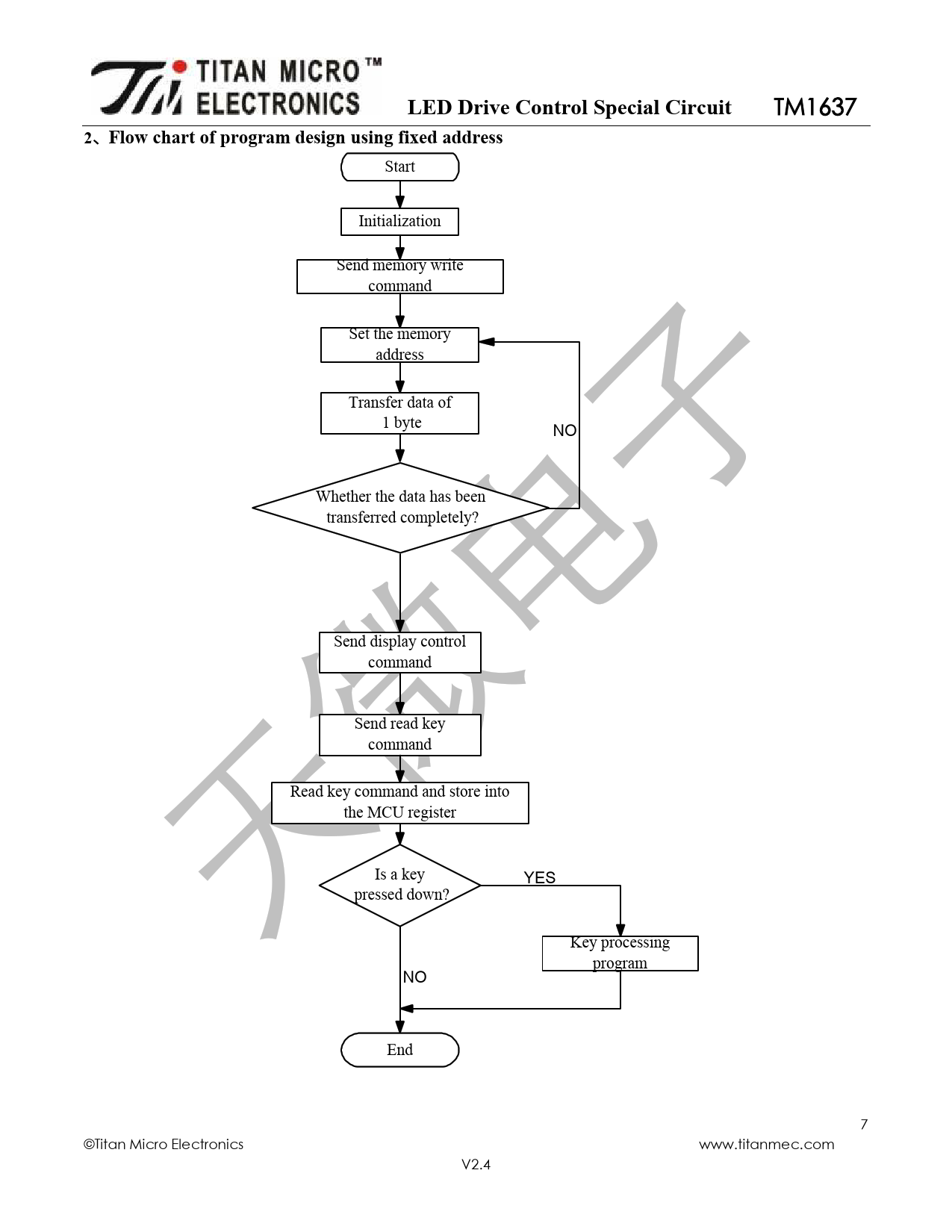 Start Initialization Send memory write command Set the memory address Transfer data of 1 byte NO Whether the data has been transferred completely? Send display control command Send read key command Read key command and store into the MCU register Is a key YES pressed down? Key processing program NO End 7 ©Titan Micro Electronics www.titanmec.com V2.4