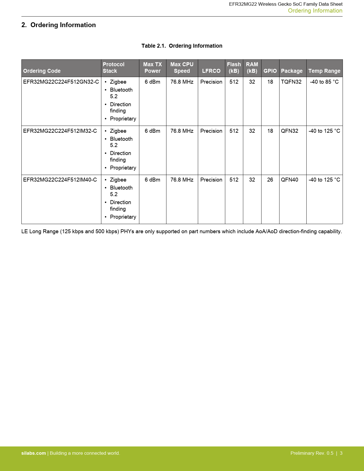EFR32MG22C224F512GN32-C • Zigbee 6 dBm 76.8 MHz Precision 512 32 18 TQFN32 -40 to 85 °C • Bluetooth 5.2 • Direction finding • Proprietary EFR32MG22C224F512IM32-C • Zigbee 6 dBm 76.8 MHz Precision 512 32 18 QFN32 -40 to 125 °C • Bluetooth 5.2 • Direction finding • Proprietary EFR32MG22C224F512IM40-C • Zigbee 6 dBm 76.8 MHz Precision 512 32 26 QFN40 -40 to 125 °C • Bluetooth 5.2 • Direction finding • Proprietary LE Long Range (125 kbps and 500 kbps) PHYs are only supported on part numbers which include AoA/AoD direction-finding capability.