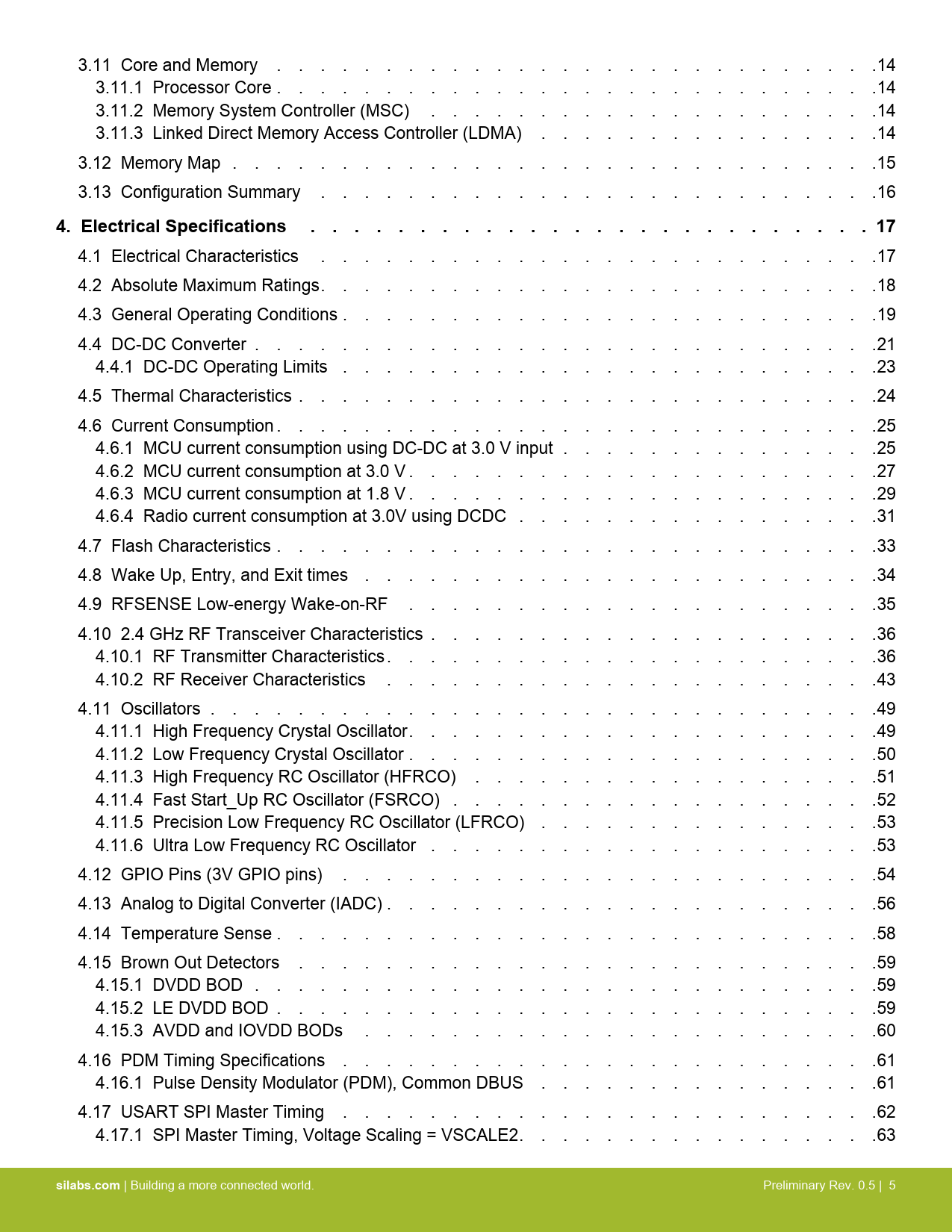| Building a more connected world. Preliminary Rev. 0.5 | 5 Document Outline 1. Feature List 2. Ordering Information 3. System Overview 3.1 Introduction 3.2 Radio 3.2.1 Antenna Interface 3.2.2 Fractional-N Frequency Synthesizer 3.2.3 Receiver Architecture 3.2.4 Transmitter Architecture 3.2.5 Packet and State Trace 3.2.6 Data Buffering 3.2.7 Radio Controller (RAC) 3.2.8 RFSENSE Interface 3.3 General Purpose Input/Output (GPIO) 3.4 Clocking 3.4.1 Clock Management Unit (CMU) 3.4.2 Internal and External Oscillators 3.5 Counters/Timers and PWM 3.5.1 Timer/Counter (TIMER) 3.5.2 Low Energy Timer (LETIMER) 3.5.3 Real Time Clock with Capture (RTCC) 3.5.4 Back-Up Real Time Counter 3.5.5 Watchdog Timer (WDOG) 3.6 Communications and Other Digital Peripherals 3.6.1 Universal Synchronous/Asynchronous Receiver/Transmitter (USART) 3.6.2 Enhanced Universal Asynchronous Receiver/Transmitter (EUART) 3.6.3 Inter-Integrated Circuit Interface (I2C) 3.6.4 Peripheral Reflex System (PRS) 3.6.5 Pulse Density Modulation (PDM) Interface 3.7 Security Features 3.7.1 Secure Boot with Root of Trust and Secure Loader (RTSL) 3.7.2 Cryptographic Accelerator 3.7.3 True Random Number Generator 3.7.4 Secure Debug with Lock/Unlock 3.8 Analog 3.8.1 Analog to Digital Converter (IADC) 3.9 Power 3.9.1 Energy Management Unit (EMU) 3.9.2 Voltage Scaling 3.9.3 DC-DC Converter 3.9.4 Power Domains 3.10 Reset Management Unit (RMU) 3.11 Core and Memory 3.11.1 Processor Core 3.11.2 Memory System Controller (MSC) 3.11.3 Linked Direct Memory Access Controller (LDMA) 3.12 Memory Map 3.13 Configuration Summary 4. Electrical Specifications 4.1 Electrical Characteristics 4.2 Absolute Maximum Ratings 4.3 General Operating Conditions 4.4 DC-DC Converter 4.4.1 DC-DC Operating Limits 4.5 Thermal Characteristics 4.6 Current Consumption 4.6.1 MCU current consumption using DC-DC at 3.0 V input 4.6.2 MCU current consumption at 3.0 V 4.6.3 MCU current consumption at 1.8 V 4.6.4 Radio current consumption at 3.0V using DCDC 4.7 Flash Characteristics 4.8 Wake Up, Entry, and Exit times 4.9 RFSENSE Low-energy Wake-on-RF 4.10 2.4 GHz RF Transceiver Characteristics 4.10.1 RF Transmitter Characteristics 4.10.1.1 RF Transmitter General Characteristics for the 2.4 GHz Band 4.10.1.2 RF Transmitter Characteristics for 802.15.4 DSSS-OQPSK in the 2.4 GHz Band 4.10.1.3 RF Transmitter Characteristics for Bluetooth Low Energy in the 2.4 GHz Band 1 Mbps Data Rate 4.10.1.4 RF Transmitter Characteristics for Bluetooth Low Energy in the 2.4 GHz Band 2 Mbps Data Rate 4.10.1.5 RF Transmitter Characteristics for Bluetooth Low Energy in the 2.4 GHz Band 500 kbps Data Rate 4.10.1.6 RF Transmitter Characteristics for Bluetooth Low Energy in the 2.4 GHz Band 125 kbps Data Rate 4.10.2 RF Receiver Characteristics 4.10.2.1 RF Receiver General Characteristics for the 2.4 GHz Band 4.10.2.2 RF Receiver Characteristics for 802.15.4 DSSS-OQPSK in the 2.4 GHz Band 4.10.2.3 RF Receiver Characteristics for Bluetooth Low Energy in the 2.4 GHz Band 1 Mbps Data Rate 4.10.2.4 RF Receiver Characteristics for Bluetooth Low Energy in the 2.4 GHz Band 2 Mbps Data Rate 4.10.2.5 RF Receiver Characteristics for Bluetooth Low Energy in the 2.4 GHz Band 500 kbps Data Rate 4.10.2.6 RF Receiver Characteristics for Bluetooth Low Energy in the 2.4 GHz Band 125 kbps Data Rate 4.11 Oscillators 4.11.1 High Frequency Crystal Oscillator 4.11.2 Low Frequency Crystal Oscillator 4.11.3 High Frequency RC Oscillator (HFRCO) 4.11.4 Fast Start_Up RC Oscillator (FSRCO) 4.11.5 Precision Low Frequency RC Oscillator (LFRCO) 4.11.6 Ultra Low Frequency RC Oscillator 4.12 GPIO Pins (3V GPIO pins) 4.13 Analog to Digital Converter (IADC) 4.14 Temperature Sense 4.15 Brown Out Detectors 4.15.1 DVDD BOD 4.15.2 LE DVDD BOD 4.15.3 AVDD and IOVDD BODs 4.16 PDM Timing Specifications 4.16.1 Pulse Density Modulator (PDM), Common DBUS 4.17 USART SPI Master Timing 4.17.1 SPI Master Timing, Voltage Scaling = VSCALE2 4.17.2 SPI Master Timing, Voltage Scaling = VSCALE1 4.18 USART SPI Slave Timing 4.18.1 SPI Slave Timing, Voltage Scaling = VSCALE2 4.18.2 SPI Slave Timing, Voltage Scaling = VSCALE1 4.19 I2C Electrical Specifications 4.19.1 I2C Standard-mode (Sm) 4.19.2 I2C Fast-mode (Fm) 4.19.3 I2C Fast-mode Plus (Fm+) 4.20 Typical Performance Curves 4.20.1 Supply Current 4.20.2 RF Characteristics 4.20.3 DC-DC Converter 5. Typical Connections 5.1 Power 5.2 RF Matching Networks 5.2.1 2.4 GHz Matching Network 5.3 Other Connections 6. Pin Definitions 6.1 QFN40 Device Pinout 6.2 TQFN32 Device Pinout 6.3 QFN32 Device Pinout 6.4 Alternate Function Table 6.5 Analog Peripheral Connectivity 6.6 Digital Peripheral Connectivity 7. QFN32 Package Specifications 7.1 QFN32 Package Dimensions 7.2 QFN32 PCB Land Pattern 7.3 QFN32 Package Marking 8. TQFN32 Package Specifications 8.1 TQFN32 Package Dimensions 8.2 TQFN32 PCB Land Pattern 8.3 TQFN32 Package Marking 9. QFN40 Package Specifications 9.1 QFN40 Package Dimensions 9.2 QFN40 PCB Land Pattern 9.3 QFN40 Package Marking 10. Revision History