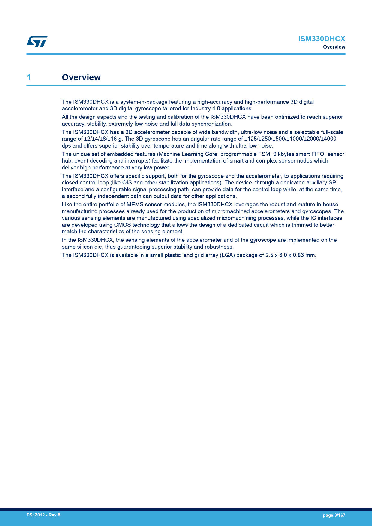 | Pages / Page | 167 / 3 — ISM330DHCX. Overview. DS13012. Rev 5. page 3/167 |
