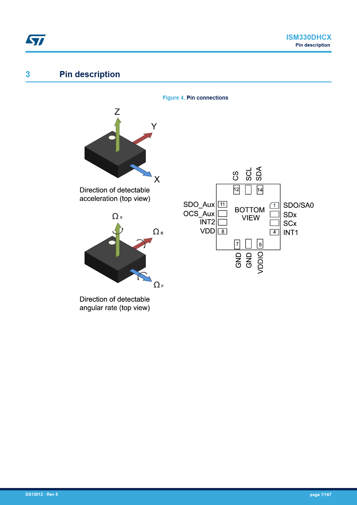 | Pages / Page | 167 / 7 — ISM330DHCX. Pin description. Figure 4. Pin connections. DS13012. Rev 5. … |
