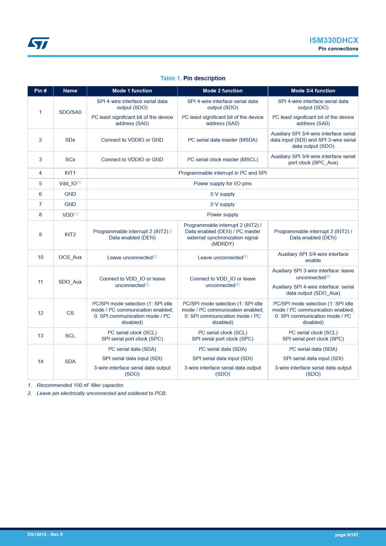 ISM330DHCX. Pin connections. Table 1. Pin description. Pin #. Name. Mode 1 function. Mode 2 function. Mode 3/4 function. DS13012. Rev 5