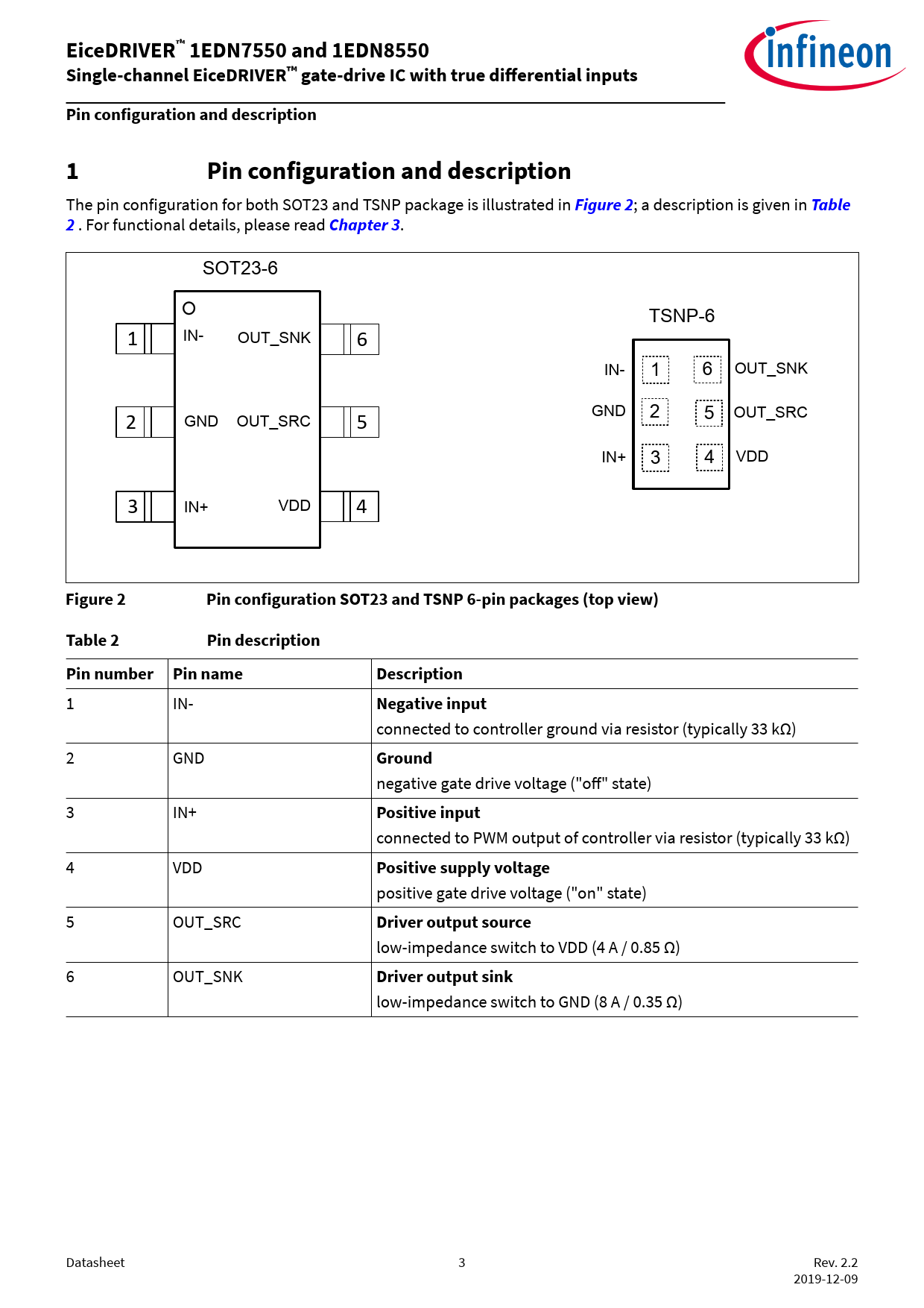 EiceDRIVER™ 1EDN7550 and 1EDN8550 Single-channel EiceDRIVER™ gate-drive IC with true differential inputs Pin configuration and description 1 Pin configuration and description