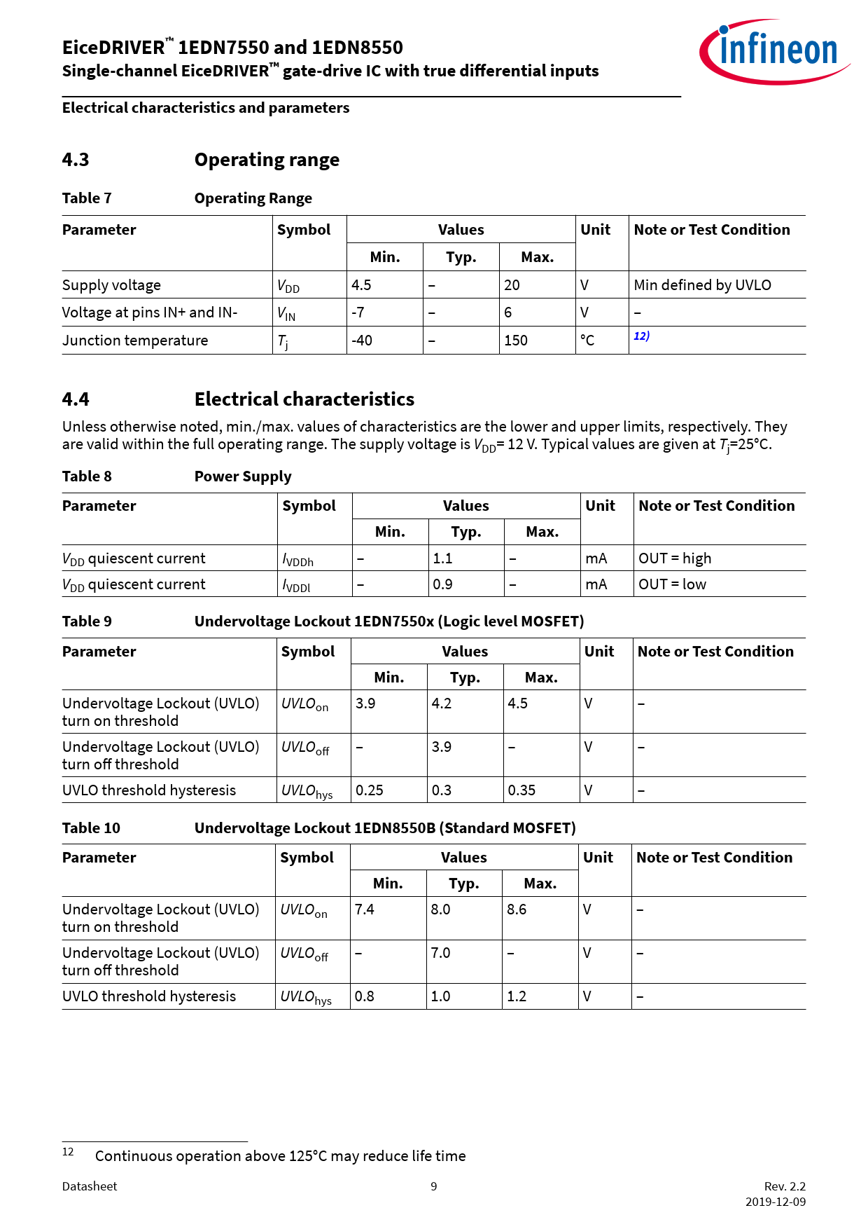 Table 9 Undervoltage Lockout 1EDN7550x (Logic level MOSFET) Parameter Symbol Values Unit Note or Test Condition Min. Typ. Max.