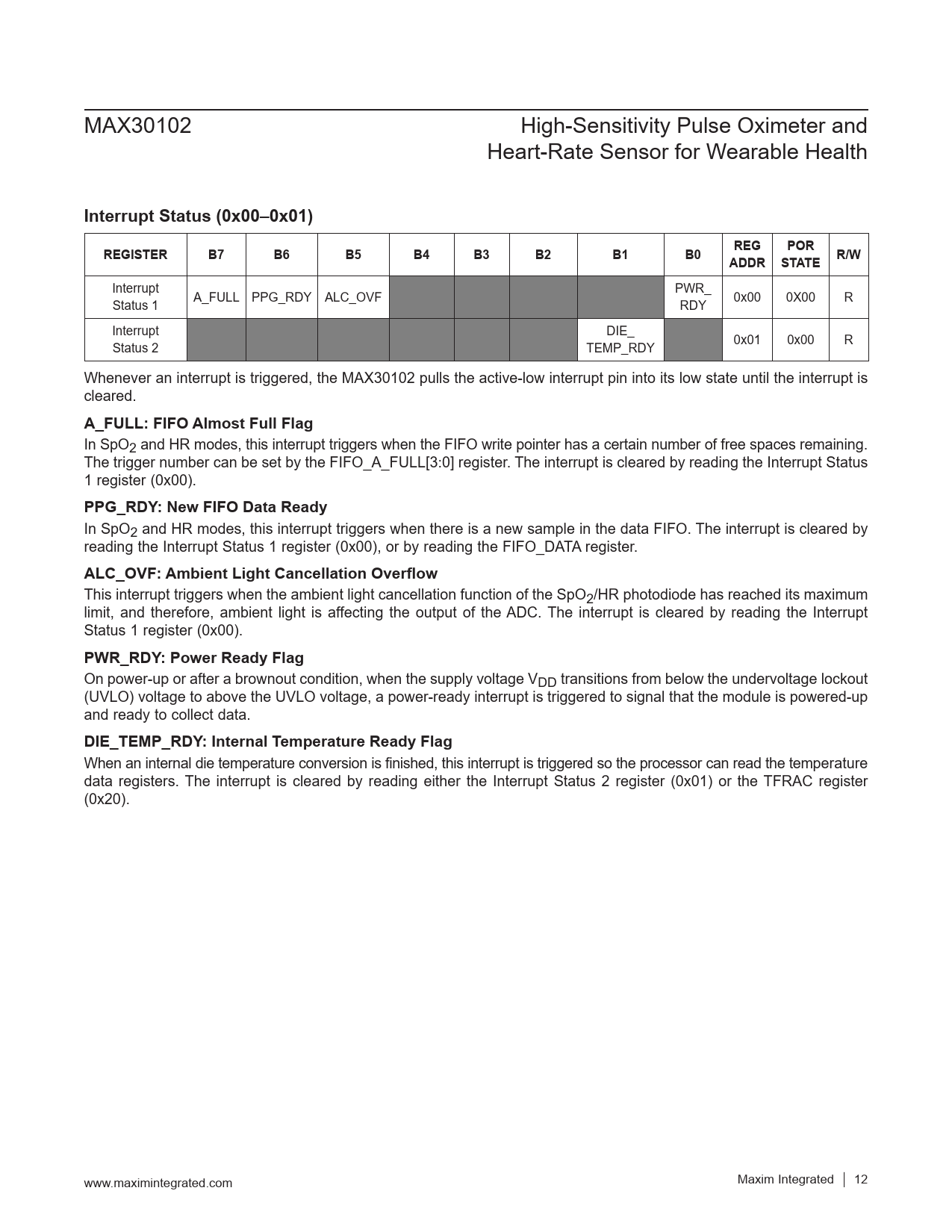 Interrupt Status (0x00–0x01). REGISTER. REG. POR. ADDR STATE R/W. A_FULL: FIFO Almost Full Flag. PPG_RDY: New FIFO Data Ready