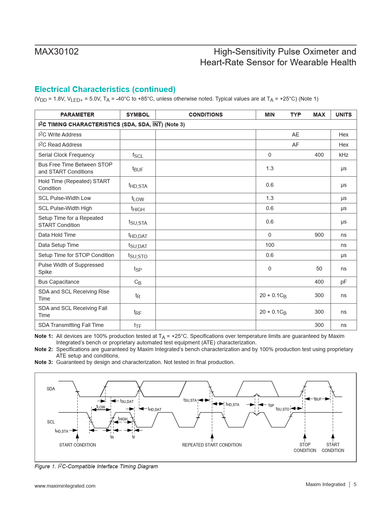 MAX30102 High-Sensitivity Pulse Oximeter and Heart-Rate Sensor for Wearable Health Electrical Characteristics (continued) (VDD = 1.8V, VLED+ = 5.0V, TA = -40°C to +85°C, unless otherwise noted. Typical values are at TA = +25°C) (Note 1) PARAMETERSYMBOLCONDITIONSMINTYPMAXUNITSI2C TIMING CHARACTERISTICS (SDA, SDA, INT) (Note 3) I2C Write Address AE Hex I2C Read Address AF Hex Serial Clock Frequency fSCL 0 400 kHz Bus Free Time Between STOP and START Conditions tBUF 1.3 µs Hold Time (Repeated) START Condition tHD;STA 0.6 µs SCL Pulse-Width Low tLOW 1.3 µs SCL Pulse-Width High tHIGH 0.6 µs Setup Time for a Repeated START Condition tSU;STA 0.6 µs Data Hold Time tHD;DAT 0 900 ns Data Setup Time tSU;DAT 100 ns Setup Time for STOP Condition tSU;STO 0.6 µs Pulse Width of Suppressed Spike tSP 0 50 ns Bus Capacitance CB 400 pF SDA and SCL Receiving Rise Time tR 20 + 0.1CB 300 ns SDA and SCL Receiving Fall Time tRF 20 + 0.1CB 300 ns SDA Transmitting Fall Time tTF 300 ns Note 1: All devices are 100% production tested at TA = +25°C. Specifications over temperature limits are guaranteed by Maxim Integrated’s bench or proprietary automated test equipment (ATE) characterization. Note 2: Specifications are guaranteed by Maxim Integrated’s bench characterization and by 100% production test using proprietary ATE setup and conditions. Note 3: Guaranteed by design and characterization. Not tested in final production. SDA t t SU,DAT tSU,STA BUF t t LOW HD,STA t t SP HD,DAT tSU,STO t SCL HIGH tHD,STA tR tF START CONDITION REPEATED START CONDITION STOP START CONDITION CONDITION Figure 1. I2C-Compatible Interface Timing Diagram www.maximintegrated.com Maxim Integrated │ 5