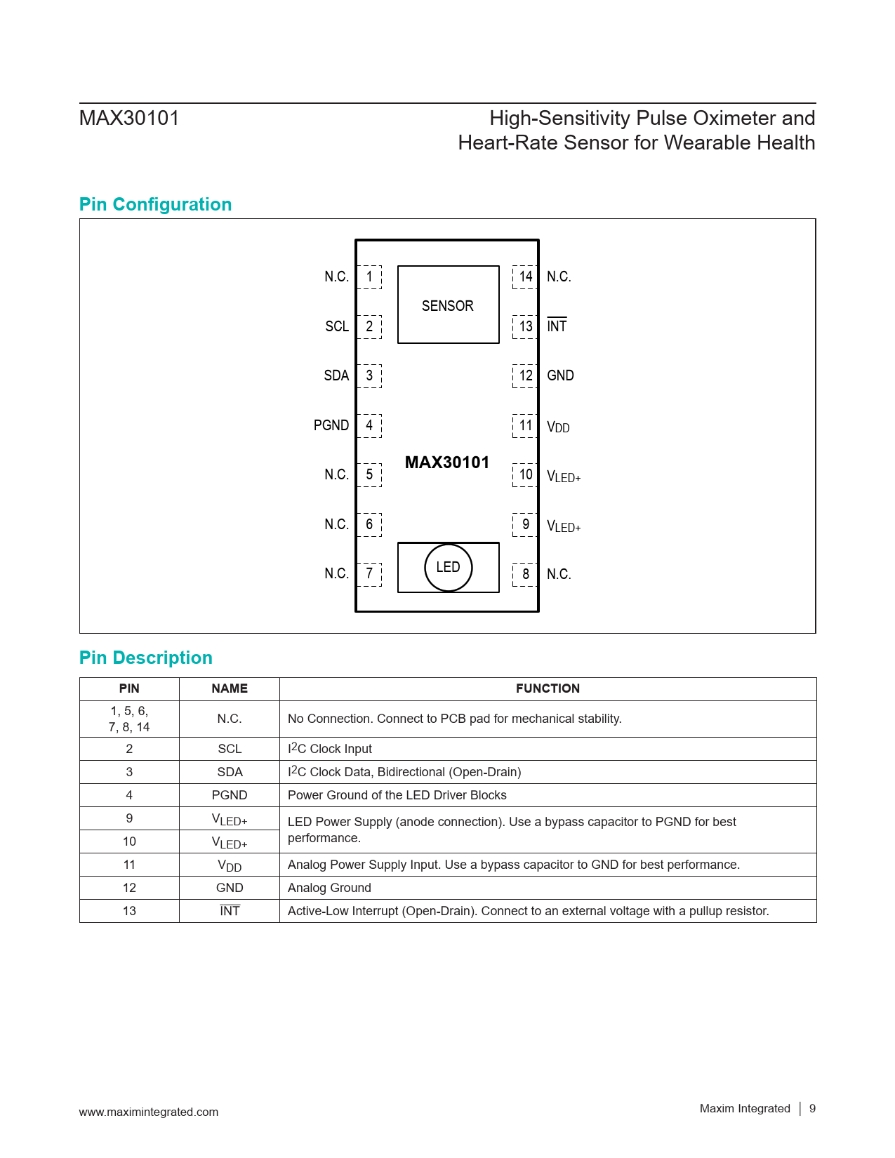 Pages / Page33 / 9 — Pin Configuration. MAX30101. Pin Description. PIN. NAME. FUNCTION