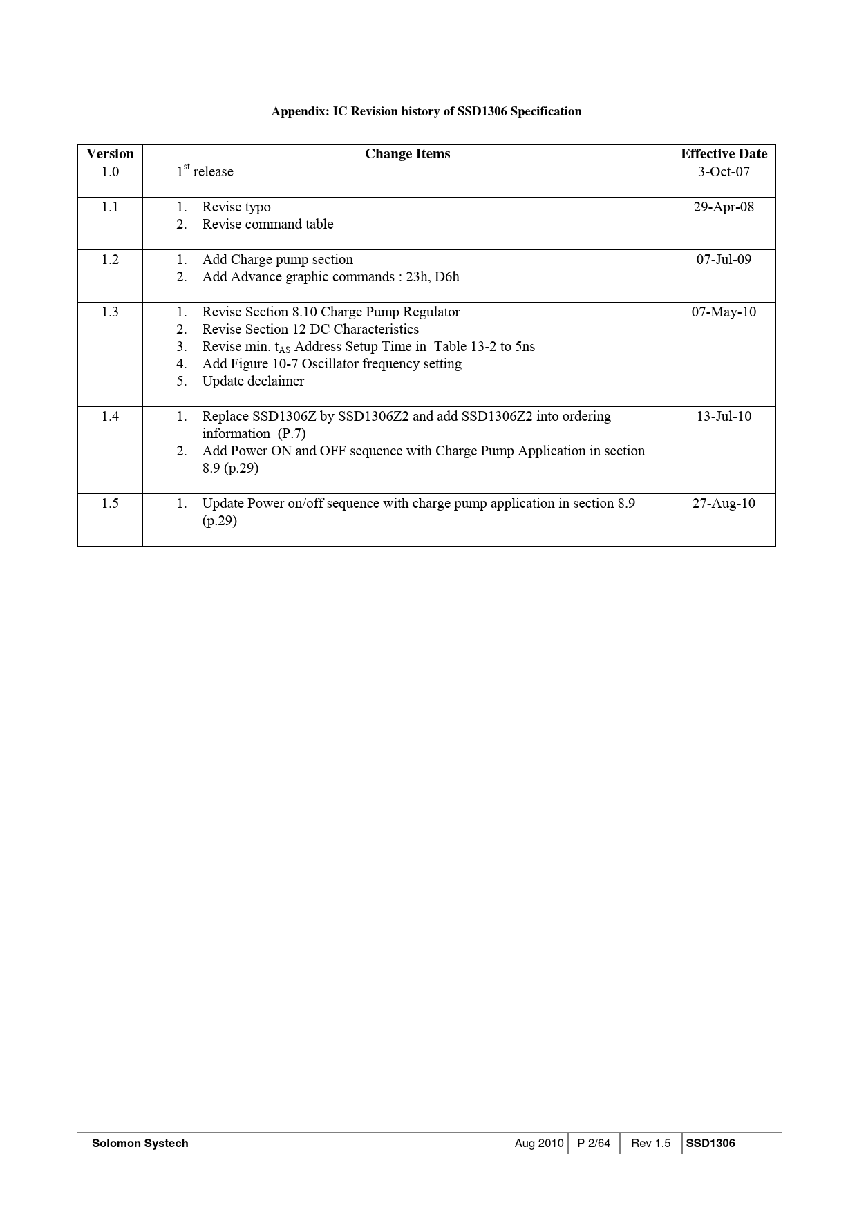 Appendix: IC Revision history of SSD1306 SpecificationVersion ChangeItems EffectiveDate 1.0 1st release 3-Oct-07 1.1 1. Revise typo 29-Apr-08 2. Revise command table 1.2 1. Add Charge pump section 07-Jul-09 2. Add Advance graphic commands : 23h, D6h 1.3 1. Revise Section 8.10 Charge Pump Regulator 07-May-10 2. Revise Section 12 DC Characteristics 3. Revise min. tAS Address Setup Time in Table 13-2 to 5ns 4. Add Figure 10-7 Oscillator frequency setting 5. Update declaimer 1.4 1. Replace SSD1306Z by SSD1306Z2 and add SSD1306Z2 into ordering 13-Jul-10 information (P.7) 2. Add Power ON and OFF sequence with Charge Pump Application in section 8.9 (p.29) 1.5 1. Update Power on/off sequence with charge pump application in section 8.9 27-Aug-10 (p.29) Solomon Systech Aug 2010 P 2/64 Rev 1.5 SSD1306 Document Outline 1 GENERAL DESCRIPTION 2 FEATURES 3 ORDERING INFORMATION 4 BLOCK DIAGRAM 5 DIE PAD FLOOR PLAN 6 PIN ARRANGEMENT 6.1 SSD1306TR1 pin assignment 7 PIN DESCRIPTION 8 FUNCTIONAL BLOCK DESCRIPTIONS 8.1 MCU Interface selection 8.1.1 MCU Parallel 6800-series Interface 8.1.2 MCU Parallel 8080-series Interface 8.1.3 MCU Serial Interface (4-wire SPI) 8.1.4 MCU Serial Interface (3-wire SPI) 8.1.5 MCU I2C Interface 8.1.5.1 I2C-bus Write data 8.1.5.2 Write mode for I2C 8.2 Command Decoder 8.3 Oscillator Circuit and Display Time Generator 8.4 FR synchronization 8.5 Reset Circuit 8.6 Segment Drivers / Common Drivers 8.7 Graphic Display Data RAM (GDDRAM) 8.8 SEG/COM Driving block 8.9 Power ON and OFF sequence 8.9.1 Power ON and OFF sequence with External VCC 8.9.2 Power ON and OFF sequence with Charge Pump Application 8.10 Charge Pump Regulator 9 COMMAND TABLE 9.1 Data Read / Write 10 COMMAND DESCRIPTIONS 10.1 Fundamental Command 10.1.1 Set Lower Column Start Address for Page Addressing Mode (00h~0Fh) 10.1.2 Set Higher Column Start Address for Page Addressing Mode (10h~1Fh) 10.1.3 Set Memory Addressing Mode (20h) 10.1.4 Set Column Address (21h) 10.1.5 Set Page Address (22h) 10.1.6 Set Display Start Line (40h~7Fh) 10.1.7 Set Contrast Control for BANK0 (81h) 10.1.8 Set Segment Re-map (A0h/A1h) 10.1.9 Entire Display ON (A4h/A5h) 10.1.10 Set Normal/Inverse Display (A6h/A7h) 10.1.11 Set Multiplex Ratio (A8h) 10.1.12 Set Display ON/OFF (AEh/AFh) 10.1.13 Set Page Start Address for Page Addressing Mode (B0h~B7h) 10.1.14 Set COM Output Scan Direction (C0h/C8h) 10.1.15 Set Display Offset (D3h) 10.1.16 Set Display Clock Divide Ratio/ Oscillator Frequency (D5h) 10.1.17 Set Pre-charge Period (D9h) 10.1.18 Set COM Pins Hardware Configuration (DAh) 10.1.19 Set VCOMH Deselect Level (DBh) 10.1.20 NOP (E3h) 10.1.21 Status register Read 10.1.22 Charge Pump Setting (8Dh) 10.2 Graphic Acceleration Command 10.2.1 Horizontal Scroll Setup (26h/27h) 10.2.2 Continuous Vertical and Horizontal Scroll Setup (29h/2Ah) 10.2.3 Deactivate Scroll (2Eh) 10.2.4 Activate Scroll (2Fh) 10.2.5 Set Vertical Scroll Area(A3h) 10.3 Advance Graphic Command 10.3.1 Set Fade Out and Blinking (23h) 10.3.2 Set Zoom In (D6h) 11 MAXIMUM RATINGS 12 DC CHARACTERISTICS 13 AC CHARACTERISTICS 14 Application Example 15 PACKAGE INFORMATION 15.1 SSD1306TR1 Detail Dimension 15.2 SSD1306Z2 Die Tray Information