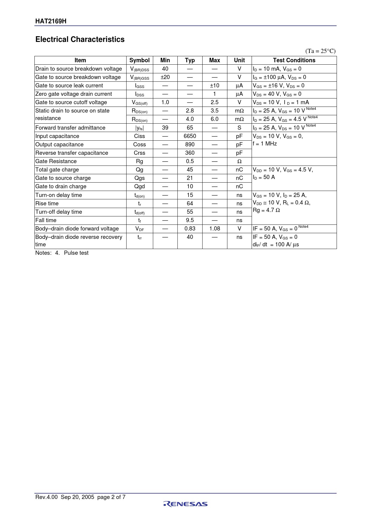 | Pages / Page | 10 / 4 — HAT2169H Electrical Characteristics. (Ta = 25°C). Item. Drain to source … |