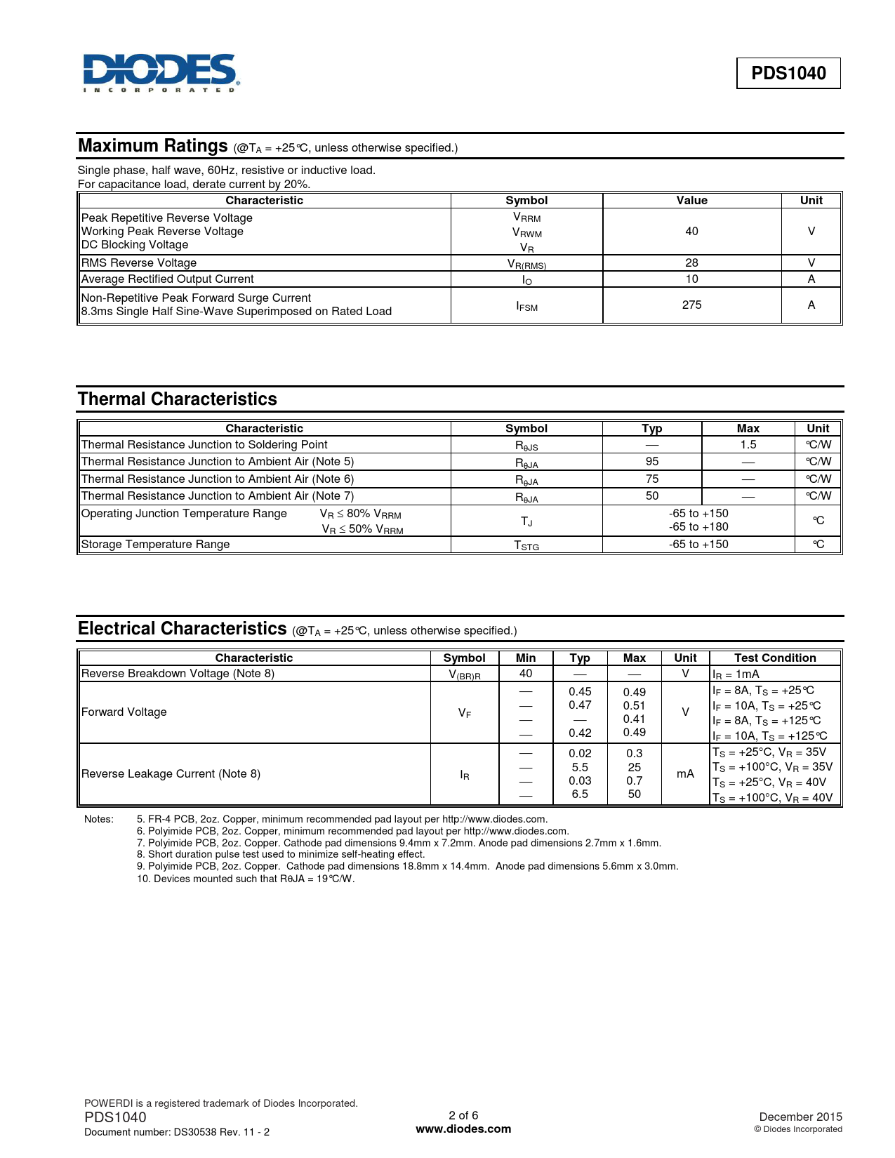 Reverse Breakdown Voltage (Note 8) V(BR)R 40 V IR = 1mA 0.45 0.49 IF = 8A, TS = +25°C 0.47 0.51 I Forward Voltage V F = 10A, TS = +25°C F V 0.41 IF = 8A, TS = +125°C 0.42 0.49 IF = 10A, TS = +125°C 0.02 0.3 TS = +25C, VR = 35V 5.5 25 T Reverse Leakage Current (Note 8) I S = +100C, VR = 35V R mA 0.03 0.7 TS = +25C, VR = 40V 6.5 50 TS = +100C, VR = 40V Notes: 5. FR-4 PCB, 2oz. Copper, minimum recommended pad layout per http://www.diodes.com. 6. Polyimide PCB, 2oz. Copper, minimum recommended pad layout per http://www.diodes.com. 7. Polyimide PCB, 2oz. Copper. Cathode pad dimensions 9.4mm x 7.2mm. Anode pad dimensions 2.7mm x 1.6mm. 8. Short duration pulse test used to minimize self-heating effect. 9. Polyimide PCB, 2oz. Copper. Cathode pad dimensions 18.8mm x 14.4mm. Anode pad dimensions 5.6mm x 3.0mm. 10. Devices mounted such that RJA = 19°C/W. POWERDI is a registered trademark of Diodes Incorporated. PDS1040 2 of 6 December 2015 Document number: DS30538 Rev. 11 - 2