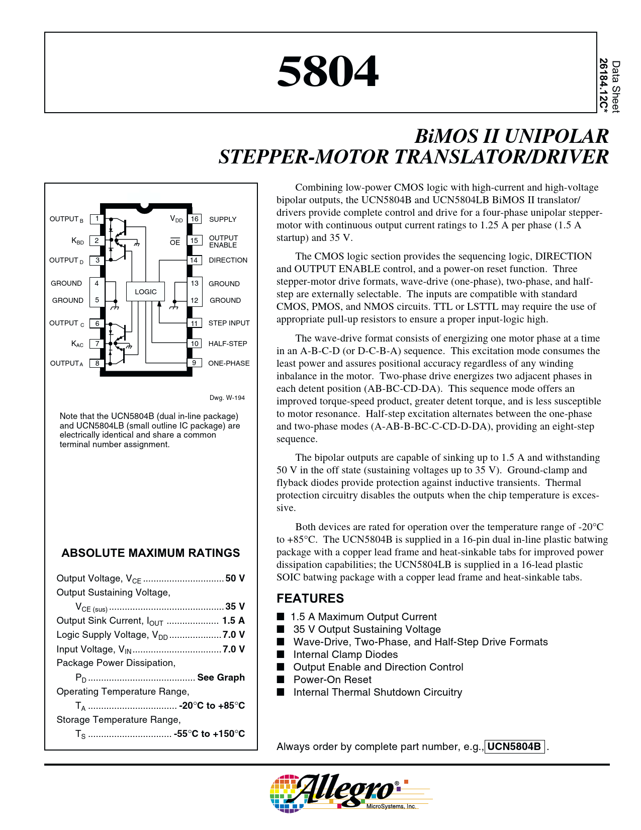 26184.12C*. 5804. BiMOS II UNIPOLAR. STEPPER-MOTOR TRANSLATOR/DRIVER. ABSOLUTE MAXIMUM RATINGS. 50 V. FEATURES. 35 V. 1.5 A. 7.0 V