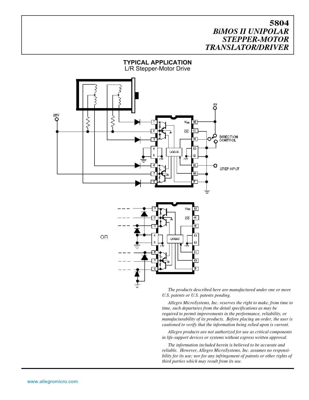 5804BiMOS II UNIPOLARSTEPPER-MOTORTRANSLATOR/DRIVERTYPICAL APPLICATION L/R Stepper-Motor Drive The products described here are manufactured under one or more U.S. patents or U.S. patents pending. Allegro MicroSystems, Inc. reserves the right to make, from time to time, such departures from the detail specifications as may be required to permit improvements in the performance, reliability, or manufacturability of its products. Before placing an order, the user is cautioned to verify that the information being relied upon is current. Allegro products are not authorized for use as critical components in life-support devices or systems without express written approval. The information included herein is believed to be accurate and reliable. However, Allegro MicroSystems, Inc. assumes no responsi- bility for its use; nor for any infringement of patents or other rights of third parties which may result from its use. www.allegromicro.com