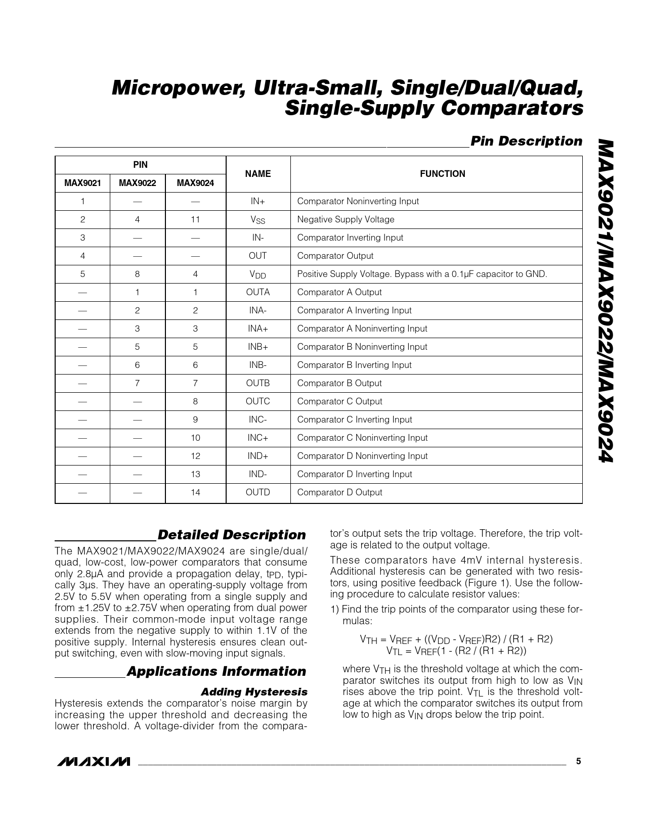 Micropower, Ultra-Small, Single/Dual/Quad,Single-Supply ComparatorsMAX9021/MAX9022/MAX9024Pin DescriptionPINNAMEFUNCTIONM A X9 0 2 1M A X9 0 2 2M A X9 0 2 4 1 — — IN+ Comparator Noninverting Input 2 4 11 VSS Negative Supply Voltage 3 — — IN- Comparator Inverting Input 4 — — OUT Comparator Output 5 8 4 VDD Positive Supply Voltage. Bypass with a 0.1µF capacitor to GND. — 1 1 OUTA Comparator A Output — 2 2 INA- Comparator A Inverting Input — 3 3 INA+ Comparator A Noninverting Input — 5 5 INB+ Comparator B Noninverting Input — 6 6 INB- Comparator B Inverting Input — 7 7 OUTB Comparator B Output — — 8 OUTC Comparator C Output — — 9 INC- Comparator C Inverting Input — — 10 INC+ Comparator C Noninverting Input — — 12 IND+ Comparator D Noninverting Input — — 13 IND- Comparator D Inverting Input — — 14 OUTD Comparator D Output Detailed Description tor’s output sets the trip voltage. Therefore, the trip volt- age is related to the output voltage. The MAX9021/MAX9022/MAX9024 are single/dual/ quad, low-cost, low-power comparators that consume These comparators have 4mV internal hysteresis. only 2.8µA and provide a propagation delay, tPD, typi- Additional hysteresis can be generated with two resis- cally 3µs. They have an operating-supply voltage from tors, using positive feedback (Figure 1). Use the follow- 2.5V to 5.5V when operating from a single supply and ing procedure to calculate resistor values: from ±1.25V to ±2.75V when operating from dual power 1) Find the trip points of the comparator using these for- supplies. Their common-mode input voltage range mulas: extends from the negative supply to within 1.1V of the positive supply. Internal hysteresis ensures clean out- VTH = VREF + ((VDD - VREF)R2) / (R1 + R2) put switching, even with slow-moving input signals. VTL = VREF(1 - (R2 / (R1 + R2)) Applications Information where VTH is the threshold voltage at which the com- parator switches its output from high to low as VIN Adding Hysteresis rises above the trip point. VTL is the threshold volt- Hysteresis extends the comparator’s noise margin by age at which the comparator switches its output from increasing the upper threshold and decreasing the low to high as VIN drops below the trip point. lower threshold. A voltage-divider from the compara- _______________________________________________________________________________________5