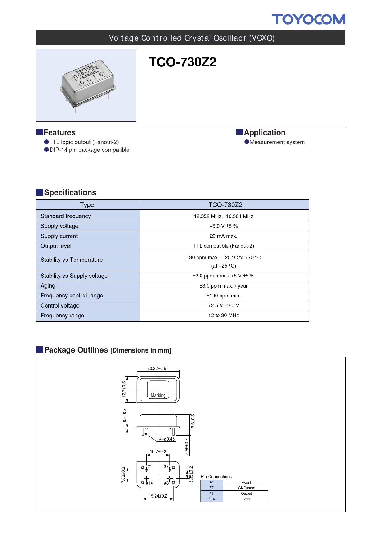Voltage Controlled Crystal Oscillaor (VCXO)TCO-730Z2FeaturesApplication TTL logic output (Fanout-2) Measurement system DIP-14 pin package compatible Specifications Type TCO-730Z2 Standard frequency 12.352 MHz, 16.384 MHz Supply voltage +5.0 V ±5 % Supply current 20 mA max. Output level TTL compatible (Fanout-2) ±30 ppm max. / -20 °C to +70 °C Stability vs Temperature (at +25 °C) Stability vs Supply voltage ±2.0 ppm max. / +5 V ±5 % Aging ±3.0 ppm max. / year Frequency control range ±100 ppm min. Control voltage +2.5 V ±2.0 V Frequency range 12 to 30 MHz Package Outlines [Dimensions in mm] 20.32±0.5 ±0.5 12.7 Marking ±0.2 0.8 ±0.5 8.6 4–ø0.45 ±0.7 10.7±0.2 5.55 #1 #7 ±0.2 ±0.2 Pin Connections 7.62 5.35 #14 #8 #1 Vcont #7 GND/case #8 Output 15.24±0.2 #14 Vcc