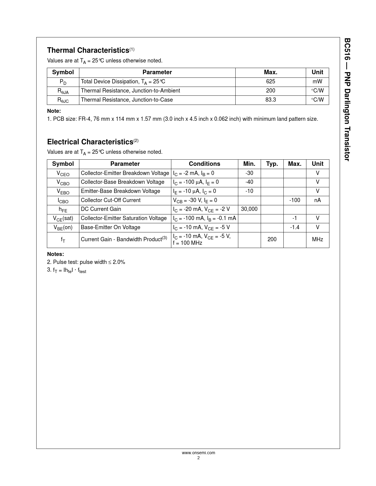 Pages / Page4 / 2 — BC516. Thermal Characteristics. — PNP Darlington T. Symbol. Parameter. …