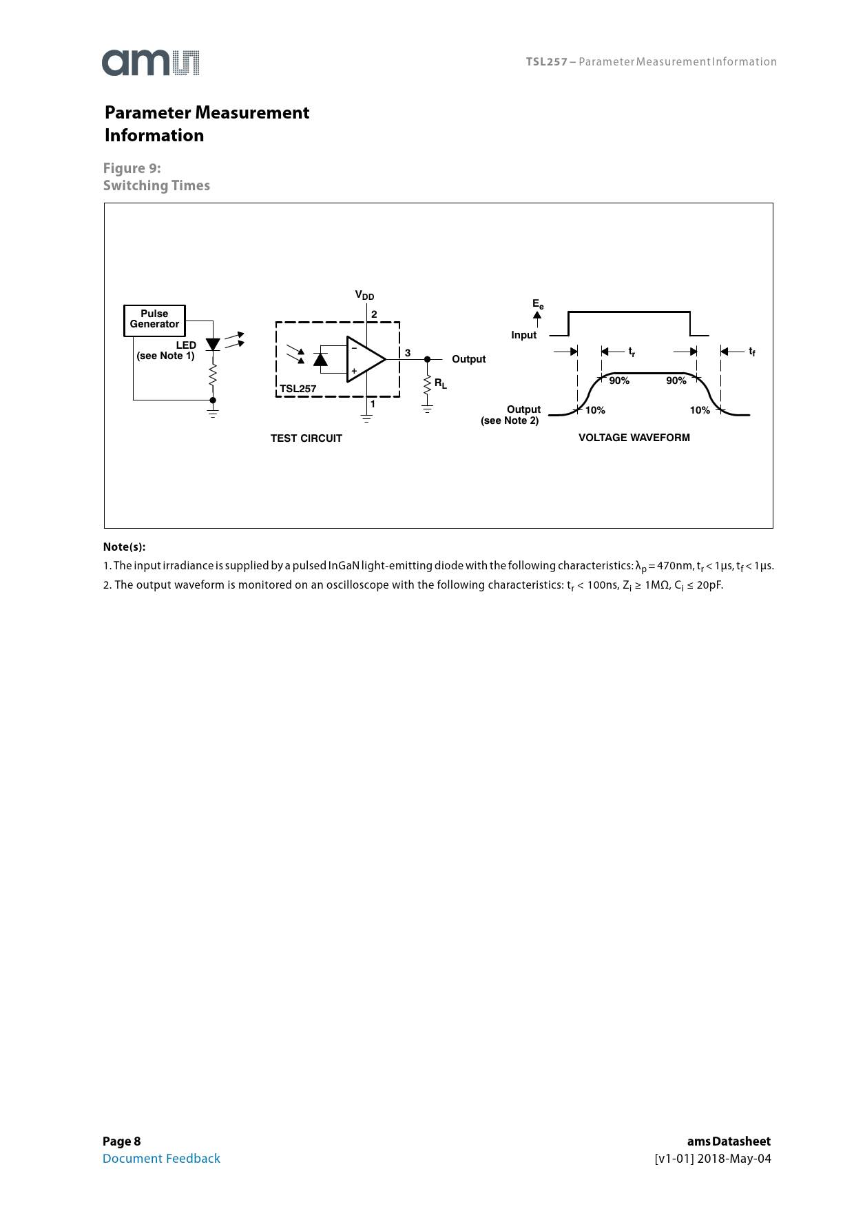 TSL257 − Parameter Measurement Information Parameter Measurement InformationFigure 9: Switching TimesVDDEePulse2GeneratorInputLEDï3tr(see Note 1)tfOutput+90%R90%TSL257L1Output10%10%(see Note 2)TEST CIRCUITVOLTAGE WAVEFORMNote(s): 1. The input irradiance is supplied by a pulsed InGaN light-emitting diode with the following characteristics: λp = 470nm, tr < 1μs, tf < 1μs. 2. The output waveform is monitored on an oscilloscope with the following characteristics: tr < 100ns, Zi ≥ 1MΩ, Ci ≤ 20pF. Page 8ams Datasheet Document Feedback [v1-01] 2018-May-04 Document Outline General Description Key Benefits & Features Functional Block Diagram Pin Assignment Absolute Maximum Ratings Electrical Characteristics Operating Conditions Parameter Measurement Information Typical Operating Characteristics Package Mechanical Data Plastic Single-In-Line Side-Looker Package Ordering & Contact Information RoHS Compliant & ams Green Statement Copyrights & Disclaimer Document Status Revision Information Content Guide