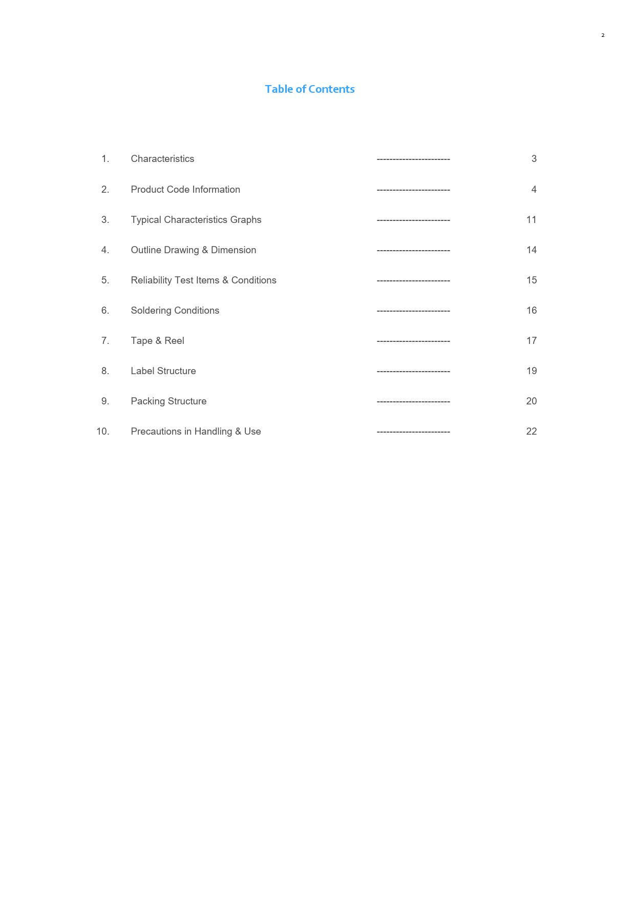 1. Characteristics ----------------------- 3 2. Product Code Information ----------------------- 4 3. Typical Characteristics Graphs ----------------------- 11 4. Outline Drawing & Dimension ----------------------- 14 5. Reliability Test Items & Conditions ----------------------- 15 6. Soldering Conditions ----------------------- 16 7. Tape & Reel ----------------------- 17 8. Label Structure ----------------------- 19 9. Packing Structure ----------------------- 20 10. Precautions in Handling & Use ----------------------- 22