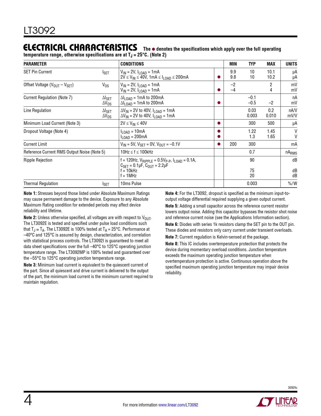 LT3092 elecTrical characTerisTicsThe l denotes the specifications which apply over the full operatingtemperature range, otherwise specifications are at TJ = 25°C. (Note 2) PARAMETERCONDITIONSMINTYPMAXUNITS SET Pin Current ISET VIN = 2V, ILOAD = 1mA 9.9 10 10.1 µA 2V ≤ VIN ≤ 40V, 1mA ≤ ILOAD ≤ 200mA l 9.8 10 10.2 µA Offset Voltage (VOUT – VSET) VOS VIN = 2V, ILOAD = 1mA –2 2 mV VIN = 2V, ILOAD = 1mA l –4 4 mV Current Regulation (Note 7) ∆ISET ∆ILOAD = 1mA to 200mA –0.1 nA ∆VOS ∆ILOAD = 1mA to 200mA l –0.5 –2 mV Line Regulation ∆ISET ∆VIN = 2V to 40V, ILOAD = 1mA 0.03 0.2 nA/V ∆VOS ∆VIN = 2V to 40V, ILOAD = 1mA 0.003 0.010 mV/V Minimum Load Current (Note 3) 2V ≤ VIN ≤ 40V l 300 500 µA Dropout Voltage (Note 4) ILOAD = 10mA l 1.22 1.45 V ILOAD = 200mA l 1.3 1.65 V Current Limit VIN = 5V, VSET = 0V, VOUT = –0.1V l 200 300 mA Reference Current RMS Output Noise (Note 5) 10Hz ≤ f ≤ 100kHz 0.7 nARMS Ripple Rejection f = 120Hz, VRIPPLE = 0.5VP-P, ILOAD = 0.1A, 90 dB CSET = 0.1µF, COUT = 2.2µF f = 10kHz 75 dB f = 1MHz 20 dB Thermal Regulation ISET 10ms Pulse 0.003 %/W Note 1: Stresses beyond those listed under Absolute Maximum Ratings Note 4: For the LT3092, dropout is specified as the minimum input-to- may cause permanent damage to the device. Exposure to any Absolute output voltage differential required supplying a given output current. Maximum Rating condition for extended periods may affect device Note 5: Adding a small capacitor across the reference current resistor reliability and lifetime. lowers output noise. Adding this capacitor bypasses the resistor shot noise Note 2: Unless otherwise specified, all voltages are with respect to VOUT. and reference current noise (see the Applications Information section). The LT3092E is tested and specified under pulse load conditions such Note 6: Diodes with series 1k resistors clamp the SET pin to the OUT pin. that TJ @ TA. The LT3092E is 100% tested at TA = 25°C. Performance at These diodes and resistors only carry current under transient overloads. –40°C and 125°C is assured by design, characterization, and correlation Note 7: Current regulation is Kelvin-sensed at the package. with statistical process controls. The LT3092I is guaranteed to meet all data sheet specifications over the full –40°C to 125°C operating junction Note 8: This IC includes overtemperature protection that protects the temperature range. The LT3092MP is 100% tested and guaranteed over device during momentary overload conditions. Junction temperature the –55°C to 125°C operating junction temperature range. exceeds the maximum operating junction temperature when overtemperature protection is active. Continuous operation above the Note 3: Minimum load current is equivalent to the quiescent current of specified maximum operating junction temperature may impair device the part. Since all quiescent and drive current is delivered to the output reliability. of the part, the minimum load current is the minimum current required to maintain regulation. 3092fc 4 For more information www.linear.com/LT3092 Document Outline Description Typical Application Absolute Maximum Ratings Pin Configuration Electrical Characteristics Typical Performance Characteristics Pin Functions Applications Information Package Description Related Parts