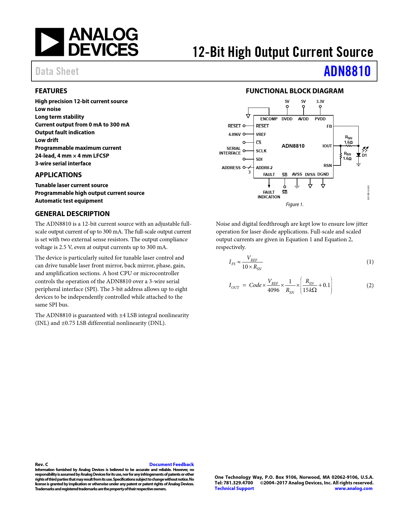 12-Bit High Output Current Source. Data Sheet. ADN8810. FEATURES. FUNCTIONAL BLOCK DIAGRAM. High precision 12-bit current source