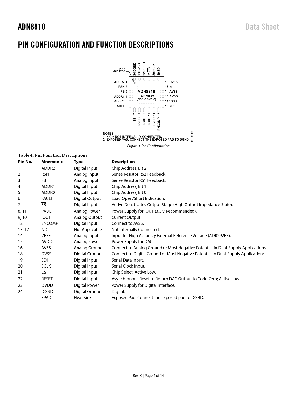 ADN8810Data SheetPIN CONFIGURATION AND FUNCTION DESCRIPTIONSKNDDDPIN 1ESETINDICATORDGDVRSCLSDICS242322212019ADDR2 118 DVSSRSN 217 NICFB 3ADN881016 AVSSADDR1 4TOP VIEW15 AVDD(Not to Scale)ADDR0 514 VREFFAULT 613 NIC789101112DTTDPSBMPVDIOUIOUPVDENCO 003 NOTES 0- 1. NIC = NOT INTERNALLY CONNECTED.2. EXPOSED PAD. CONNECT THE EXPOSED PAD TO DGND. 03195- Figure 3. Pin Configuration Table 4. Pin Function Descriptions Pin No.MnemonicTypeDescription 1 ADDR2 Digital Input Chip Address, Bit 2. 2 RSN Analog Input Sense Resistor RS2 Feedback. 3 FB Analog Input Sense Resistor RS1 Feedback. 4 ADDR1 Digital Input Chip Address, Bit 1. 5 ADDR0 Digital Input Chip Address, Bit 0. 6 FAULT Digital Output Load Open/Short Indication. 7 SB Digital Input Active Deactivates Output Stage (High Output Impedance State). 8, 11 PVDD Analog Power Power Supply for IOUT (3.3 V Recommended). 9, 10 IOUT Analog Output Current Output. 12 ENCOMP Digital Input Connect to AVSS. 13, 17 NIC Not Applicable Not Internally Connected. 14 VREF Analog Input Input for High Accuracy External Reference Voltage (ADR292ER). 15 AVDD Analog Power Power Supply for DAC. 16 AVSS Analog Ground Connect to Analog Ground or Most Negative Potential in Dual-Supply Applications. 18 DVSS Digital Ground Connect to Digital Ground or Most Negative Potential in Dual-Supply Applications. 19 SDI Digital Input Serial Data Input. 20 SCLK Digital Input Serial Clock Input. 21 CS Digital Input Chip Select; Active Low. 22 RESET Digital Input Asynchronous Reset to Return DAC Output to Code Zero; Active Low. 23 DVDD Digital Power Power Supply for Digital Interface. 24 DGND Digital Ground Digital. EPAD Heat Sink Exposed Pad. Connect the exposed pad to DGND. Rev. C | Page 6 of 14 Document Outline FEATURES APPLICATIONS FUNCTIONAL BLOCK DIAGRAM GENERAL DESCRIPTION TABLE OF CONTENTS REVISION HISTORY SPECIFICATIONS TIMING CHARACTERISTICS ABSOLUTE MAXIMUM RATINGS ESD CAUTION PIN CONFIGURATION AND FUNCTION DESCRIPTIONS TYPICAL PERFORMANCE CHARACTERISTICS TERMINOLOGY FUNCTIONAL DESCRIPTION SETTING FULL-SCALE OUTPUT CURRENT POWER SUPPLIES SERIAL DATA INTERFACE STANDBY AND RESET MODES POWER DISSIPATION USING MULTIPLE ADN8810 DEVICES FOR ADDITIONAL OUTPUT CURRENT ADDING DITHER TO THE OUTPUT CURRENT DRIVING COMMON-ANODE LASER DIODES PCB LAYOUT RECOMMENDATIONS SUGGESTED PAD LAYOUT FOR CP-24 PACKAGE OUTLINE DIMENSIONS ORDERING GUIDE