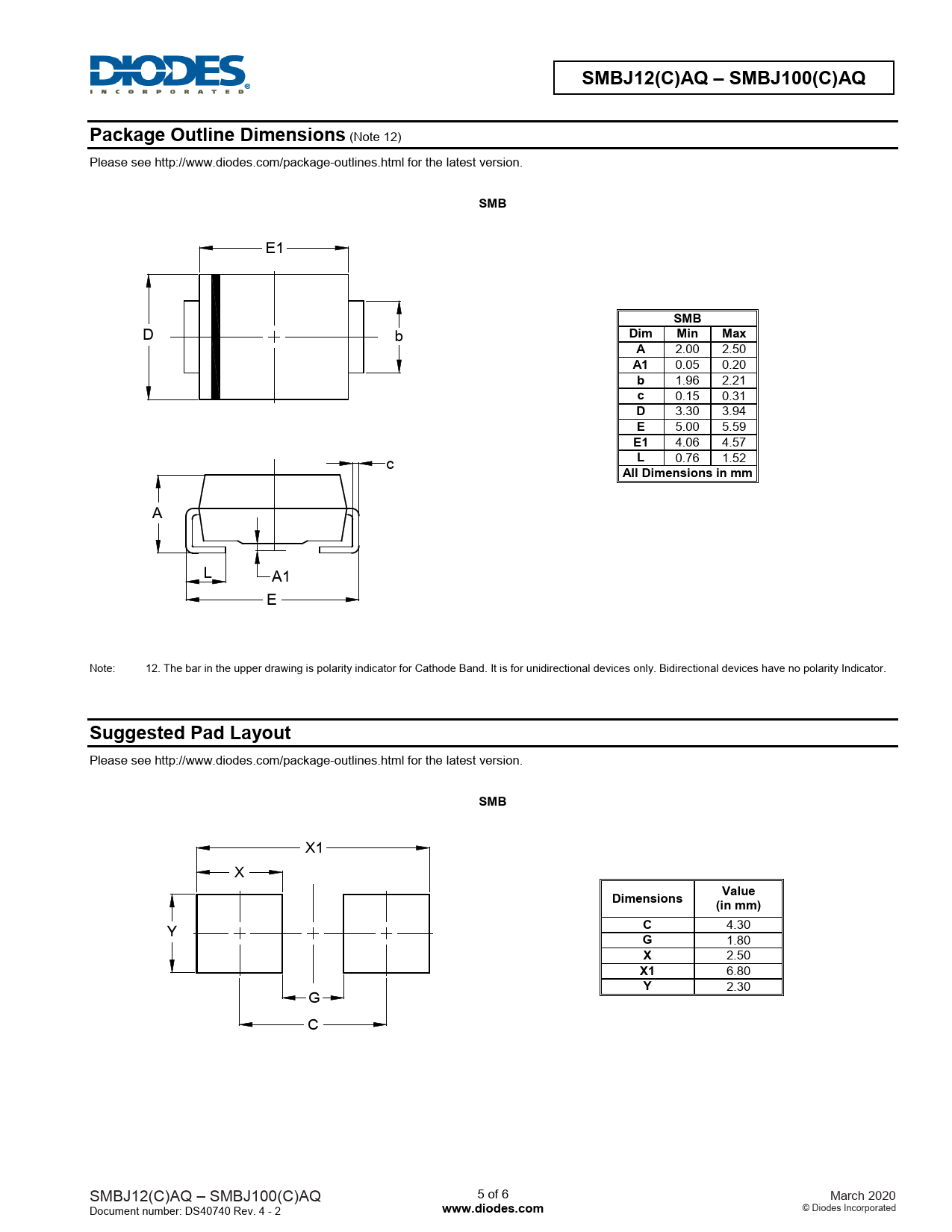 SMBJ12(C)AQ – SMBJ100(C)AQ. Package Outline Dimensions. SMB. Dim. Min. Max. All Dimensions in mm. Suggested Pad Layout. Dimensions. Value