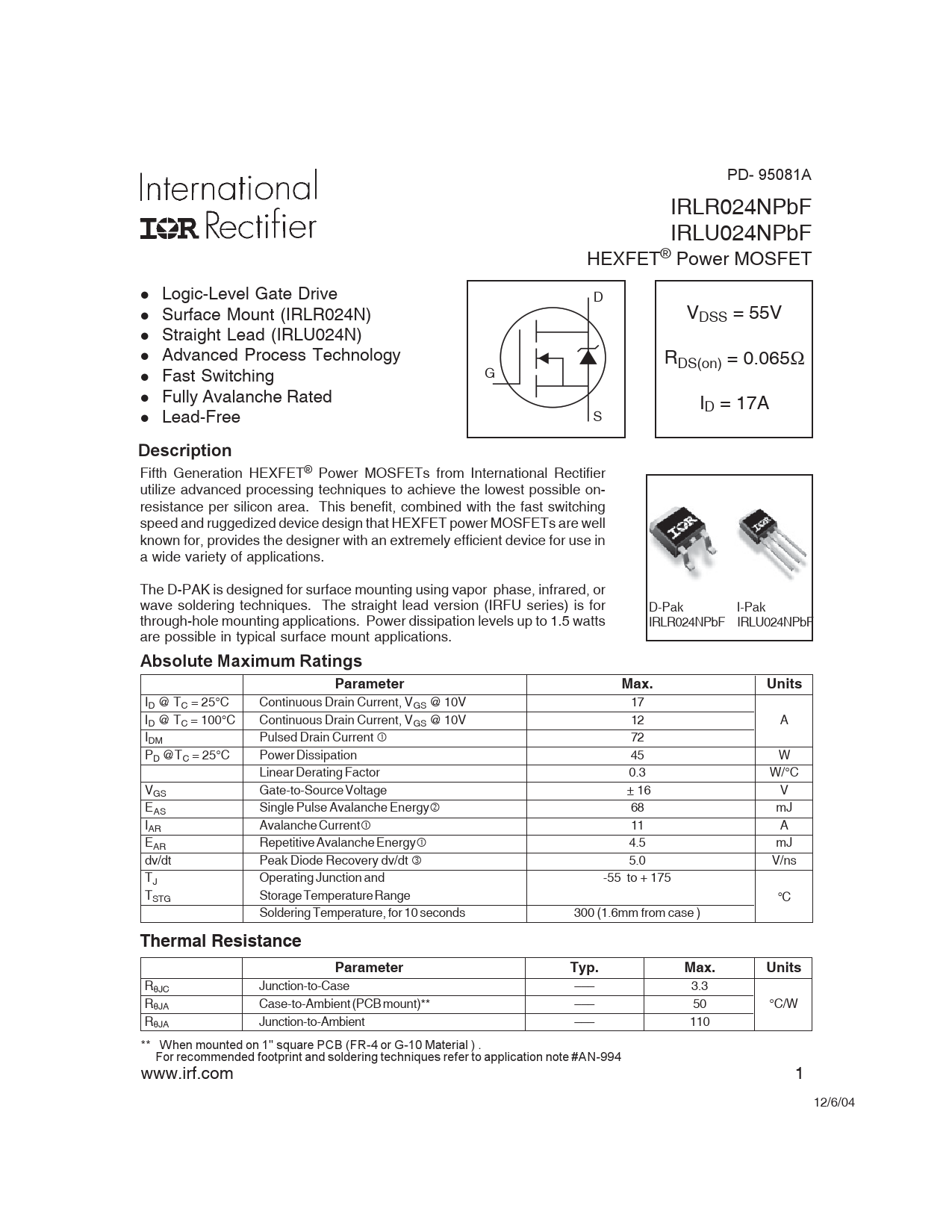 PD- 95081A IRLR024NPbF IRLU024NPbF HEXFET® Power MOSFET l Logic-Level Gate Drive D l Surface Mount (IRLR024N) VDSS = 55V l Straight Lead (IRLU024N) l Advanced Process Technology RDS(on) = 0.065Ω G l Fast Switching l Fully Avalanche Rated ID = 17A l Lead-Free S