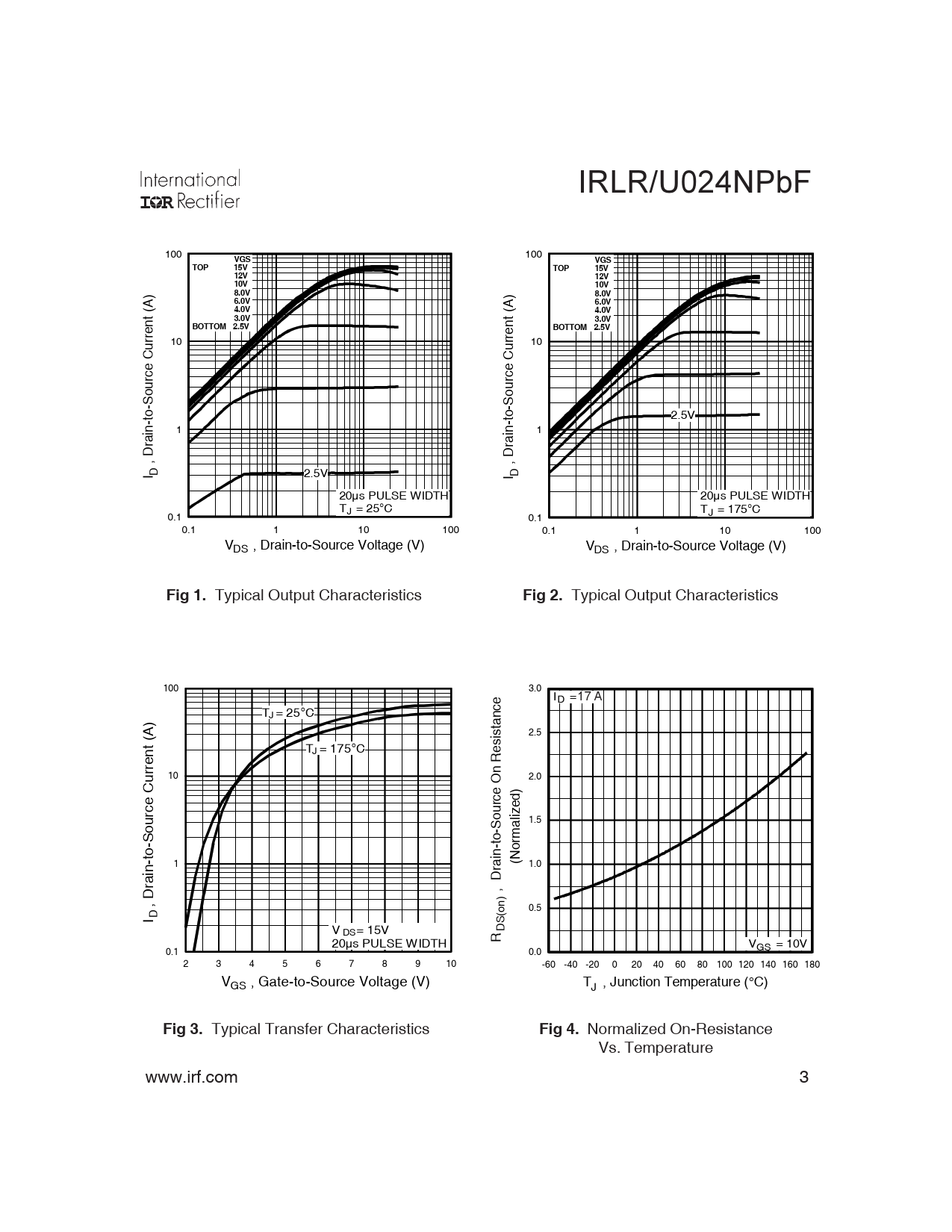 IRLR/U024NPbF 100 100 VGSVGSTOP 15VTOP 15V12V12V10V10V ) 8.0V ) 8.0V6.0V6.0V4.0V4.0V nt (A 3.0V3.0VBOTTOM 2.5V nt (A BOTTOM 2.5V 10 urre 10 urre e C ource C ourc -S -S 2.5V 1 1 rain-to rain-to I , D D 2.5V I , D D 20µs PULSE WIDTH 20µs PULSE WIDTH T = J 25°C T = J 175°C 0.1 A 0.1 A 0.1 1 10 100 0.1 1 10 100 V , Drain-to-Source Voltage (V) DS V , Drain-to-Source Voltage (V) DS Fig 1. Typical Output Characteristics Fig 2. Typical Output Characteristics 100 3.0 I D = 18A 17 T J= 25°C 2.5 t (A) n T = 175° J C esistance n R 10 urre 2.0 C e O e urc ourc 1.5 o -S alized) m -S or 1 (N in-to 1.0 rain-to , Dra D 0.5 I (on) V = 1 DS 5V , D DS 20µs PULSE WIDTH R V = 10V 0.1 GS A 0.0 A 2 3 4 5 6 7 8 9 10 -60 -40 -20 0 20 40 60 80 100 120 140 160 180 GS V , Gate-to-Source Voltage (V) J T , Junction Temperature (°C) Fig 3. Typical Transfer Characteristics Fig 4. Normalized On-Resistance Vs. Temperature www.irf.com 3