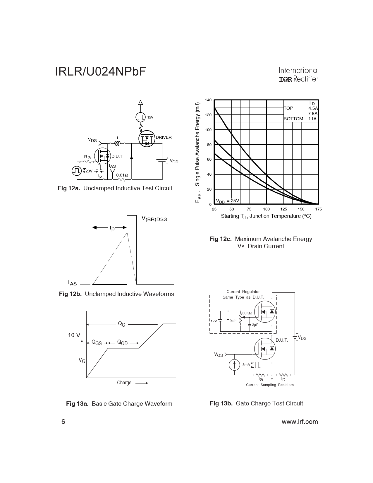 IRLR/U024NPbF 140 J) I D TOP 4.5A (m 120 7.8A 15V gy BOTTOM 11A ner 100 he E L DRIVER VDS anc 80 al RG D.U.T + 60 - VDD lse Av IAS A 20V t 0.01 p Ω 40 ingle Pu Fig 12a. Unclamped Inductive Test Circuit S 20 , AS E V = 25V 0 DD A 25 50 75 100 125 150 175 V Starting T , Junction Temperature (°C) (BR)DSS J tp Fig 12c. Maximum Avalanche Energy Vs. Drain Current IAS Current Regulator Fig 12b. Unclamped Inductive Waveforms Same Type as D.U.T. 50KΩ Q .2µF 12V G .3µF + 10 V V Q D.U.T. DS GS QGD - VGS VG 3mA I I Charge G D Current Sampling Resistors Fig 13a. Basic Gate Charge Waveform Fig 13b. Gate Charge Test Circuit 6 www.irf.com