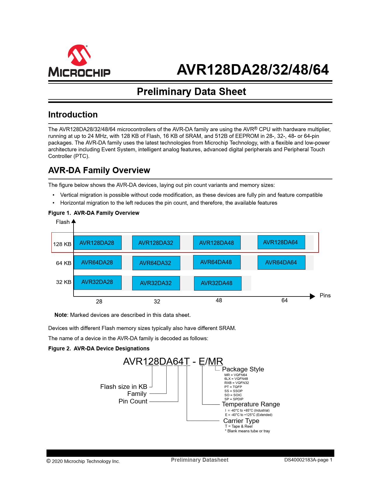Model Line for this Datasheet Text Version of Document AVR128DA28/32/48/64 Preliminary Data Sheet Introduction The AVR128DA28/32/48/64 microcontrollers of the AVR-DA family are using the AVR® CPU with hardware multiplier, running at up to 24 MHz, with 128 KB of Flash, 16 KB of SRAM, and 512B of EEPROM in 28-, 32-, 48- or 64-pin packages. The AVR-DA family uses the latest technologies from Microchip Technology, with a flexible and low-power architecture including Event System, intelligent analog features, advanced digital peripherals and Peripheral Touch Controller (PTC).AVR-DA Family Overview The figure below shows the AVR-DA devices, laying out pin count variants and memory sizes: • Vertical migration is possible without code modification, as these devices are fully pin and feature compatible • Horizontal migration to the left reduces the pin count, and therefore, the available featuresFigure 1. AVR-DA Family Overview Flash 128 KB AVR128DA28 AVR128DA32 AVR128DA48 AVR128DA64 64 KB AVR64DA28 AVR64DA32 AVR64DA48 AVR64DA64 32 KB AVR32DA28 AVR32DA32 AVR32DA48 Pins 28 32 48 64Note : Marked devices are described in this data sheet. Devices with different Flash memory sizes typically also have different SRAM. The name of a device in the AVR-DA family is decoded as follows:Figure 2. AVR-DA Device Designations AVR128DA64T - E/MRPackage Style MR = VQFN64 6LX = VQFN48 RXB = VQFN32 Flash size in KB PT = TQFP Family SS = SSOP SO = SOIC Pin Count SP = SPDIP Temperature Range I = -40°C to +85°C (Industrial) E = -40°C to +125°C (Extended) Carrier Type T = Tape & Reel * Blank means tube or tray © 2020 Microchip Technology Inc.Preliminary Datasheet DS40002183A-page 1 Document Outline Introduction AVR-DA Family Overview 1. Memory Overview 2. Peripheral Overview Features Table of Contents 1. Block Diagram 2. Pinout 2.1. 28-Pin SPDIP, SSOP and SOIC 2.2. 32-Pin VQFN and TQFP 2.3. 48-Pin VQFN and TQFP 2.4. 64-Pin VQFN and TQFP 3. I/O Multiplexing and Considerations 3.1. I/O Multiplexing 4. Hardware Guidelines 4.1. General Guidelines 4.1.1. Special Consideration for VQFN Packages 4.2. Connection for Power Supply 4.2.1. Digital Power Supply 4.3. Connection for RESET 4.4. Connection for UPDI Programming 4.5. Connecting External Crystal Oscillators 4.6. Connection for External Voltage Reference 5. Conventions 5.1. Numerical Notation 5.2. Memory Size and Type 5.3. Frequency and Time 5.4. Registers and Bits 5.4.1. Addressing Registers from Header Files 5.5. ADC Parameter Definitions 6. AVR® CPU 6.1. Features 6.2. Overview 6.3. Architecture 6.3.1. Arithmetic Logic Unit (ALU) 6.3.1.1. Hardware Multiplier 6.4. Functional Description 6.4.1. Program Flow 6.4.2. Instruction Execution Timing 6.4.3. Status Register 6.4.4. Stack and Stack Pointer 6.4.5. Register File 6.4.5.1. The X-, Y-, and Z-Registers 6.4.5.2. Extended Pointers 6.4.5.2.1. Extended Program Memory Pointer 6.4.6. Configuration Change Protection (CCP) 6.4.6.1. Sequence for Write Operation to Configuration Change Protected I/O Registers 6.4.6.2. Sequence for Execution of Self-Programming 6.4.7. On-Chip Debug Capabilities 6.5. Register Summary 6.6. Register Description 6.6.1. Configuration Change Protection 6.6.2. Stack Pointer 6.6.3. Status Register 6.6.4. Extended Z-Pointer Register 7. Memories 7.1. Overview 7.2. Memory Map 7.3. In-System Reprogrammable Flash Program Memory 7.4. SRAM Data Memory 7.5. EEPROM Data Memory 7.6. SIGROW - Signature Row 7.6.1. Signature Row Summary 7.6.2. Signature Row Description 7.6.2.1. Device ID 7.6.2.2. Temperature Sensor Calibration n 7.6.2.3. Serial Number Byte n 7.7. USERROW - User Row 7.8. FUSE - Configuration and User Fuses 7.8.1. Fuse Summary 7.8.2. Fuse Description 7.8.2.1. Watchdog Configuration 7.8.2.2. Brown-out Detector Configuration 7.8.2.3. Oscillator Configuration 7.8.2.4. System Configuration 0 7.8.2.5. System Configuration 1 7.8.2.6. Code Size 7.8.2.7. Boot Size 7.9. LOCK - Memory Sections Access Protection 7.9.1. Lock Summary 7.9.2. Lock Description 7.9.2.1. Lock Key 7.10. I/O Memory 7.10.1. Single-Cycle I/O Registers 7.10.2. Extended I/O Registers 7.10.3. Accessing 16-bit Registers 7.10.4. Accessing 24-Bit Registers 8. Peripherals and Architecture 8.1. Peripheral Address Map 8.2. Interrupt Vector Mapping 8.3. SYSCFG - System Configuration 8.3.1. Register Summary 8.3.2. Register Description 8.3.2.1. Device Revision ID Register 9. GPR - General Purpose Registers 9.1. Register Summary 9.2. Register Description 9.2.1. General Purpose Register n 10. NVMCTRL - Nonvolatile Memory Controller 10.1. Features 10.2. Overview 10.2.1. Block Diagram 10.3. Functional Description 10.3.1. Memory Organization 10.3.1.1. Flash 10.3.1.2. EEPROM 10.3.1.3. Signature Row 10.3.1.4. User Row 10.3.1.5. Fuses 10.3.2. Memory Access 10.3.2.1. Read 10.3.2.2. Programming 10.3.2.3. Command Modes 10.3.2.3.1. Flash Write Mode 10.3.2.3.2. Flash Page Erase Mode 10.3.2.3.3. Flash Multi-Page Erase Mode 10.3.2.3.4. EEPROM Write Mode 10.3.2.3.5. EEPROM Erase/Write Mode 10.3.2.3.6. EEPROM Byte Erase Mode 10.3.2.3.7. EEPROM Multi-Byte Erase Mode 10.3.2.3.8. Chip Erase Command 10.3.2.3.9. EEPROM Erase Command 10.3.3. Preventing Flash/EEPROM Corruption 10.3.4. Interrupts 10.3.5. Sleep Mode Operation 10.3.6. Configuration Change Protection 10.4. Register Summary 10.5. Register Description 10.5.1. Control A 10.5.2. Control B 10.5.3. Status 10.5.4. Interrupt Control 10.5.5. Interrupt Flags 10.5.6. Data 10.5.7. Address 11. CLKCTRL - Clock Controller 11.1. Features 11.2. Overview 11.2.1. Block Diagram - CLKCTRL 11.2.2. Signal Description 11.3. Functional Description 11.3.1. Main Clock Selection and Prescaler 11.3.2. Main Clock After Reset 11.3.3. Clock Sources 11.3.3.1. Internal Oscillators 11.3.3.1.1. Internal High-Frequency Oscillator (OSCHF) 11.3.3.1.2. 32.768 kHz Oscillator (OSC32K) 11.3.3.2. External Clock Sources 11.3.3.2.1. 32.768 kHz Crystal Oscillator (XOSC32K) 11.3.3.2.2. External Clock (EXTCLK) 11.3.4. Phase-Locked Loop (PLL) 11.3.5. Auto-