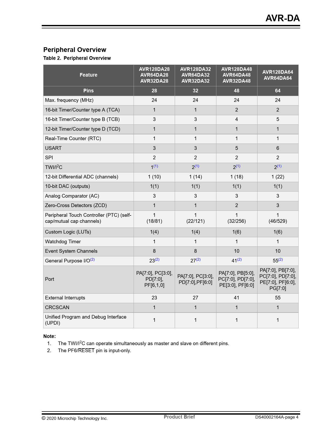AVR-DA. Peripheral Overview Table 2. Peripheral Overview. AVR128DA28. AVR128DA32. AVR128DA48. AVR128DA64. Feature. AVR64DA28. AVR64DA32