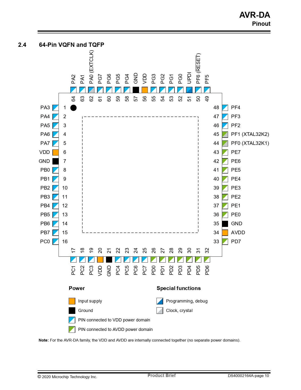 AVR-DA. Pinout. 2.4. 64-Pin VQFN and TQFP. Power. Special functions. Note:. Product Brief